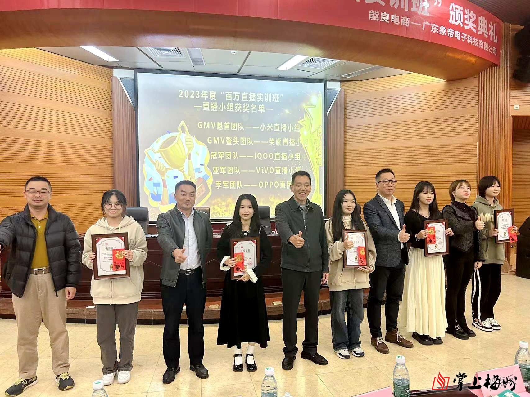 活动中,广东梅州职业技术学院与能良电商——广东象帝电子科技有限公司签订了校企合作框架协议,相关领导嘉宾为在能良电商“百万直播实训班”中表现突出、贡献卓越的师生团队及个人颁奖。