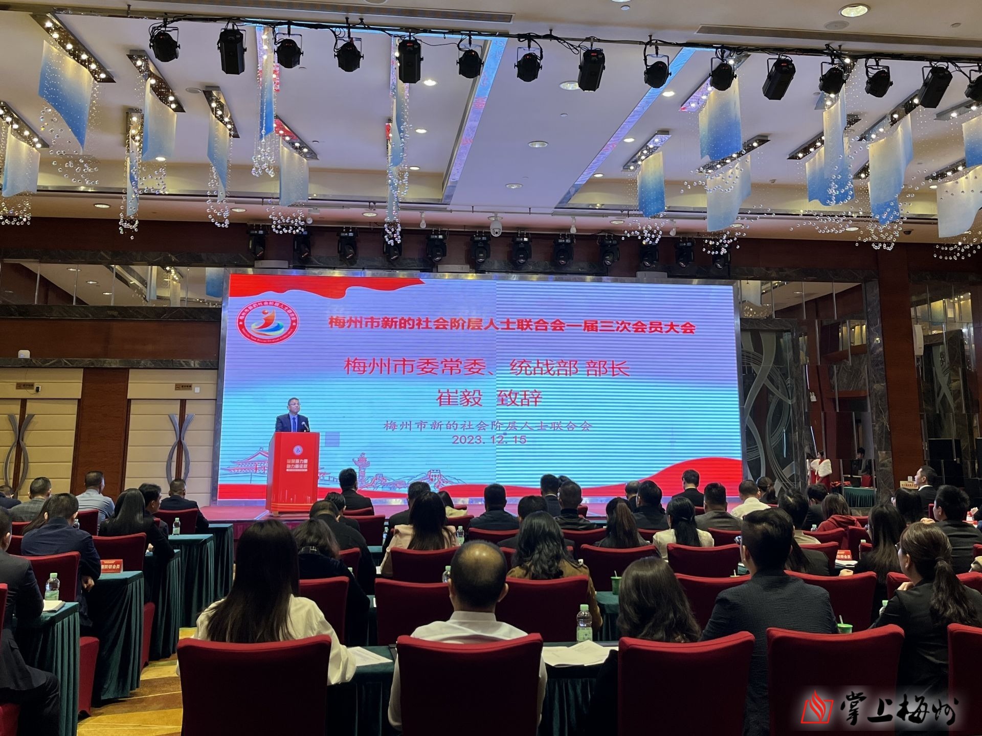掌上梅州讯 12月15日下午,梅州市新的社会阶层人士联合会一届三次会员大会暨“新阶人”助力“百县千镇万村高质量发展工程”动员会在梅城召开。市委常委、统战部部长崔毅,市新阶联会长刘榆厚及会员代表共150人参加大会。
