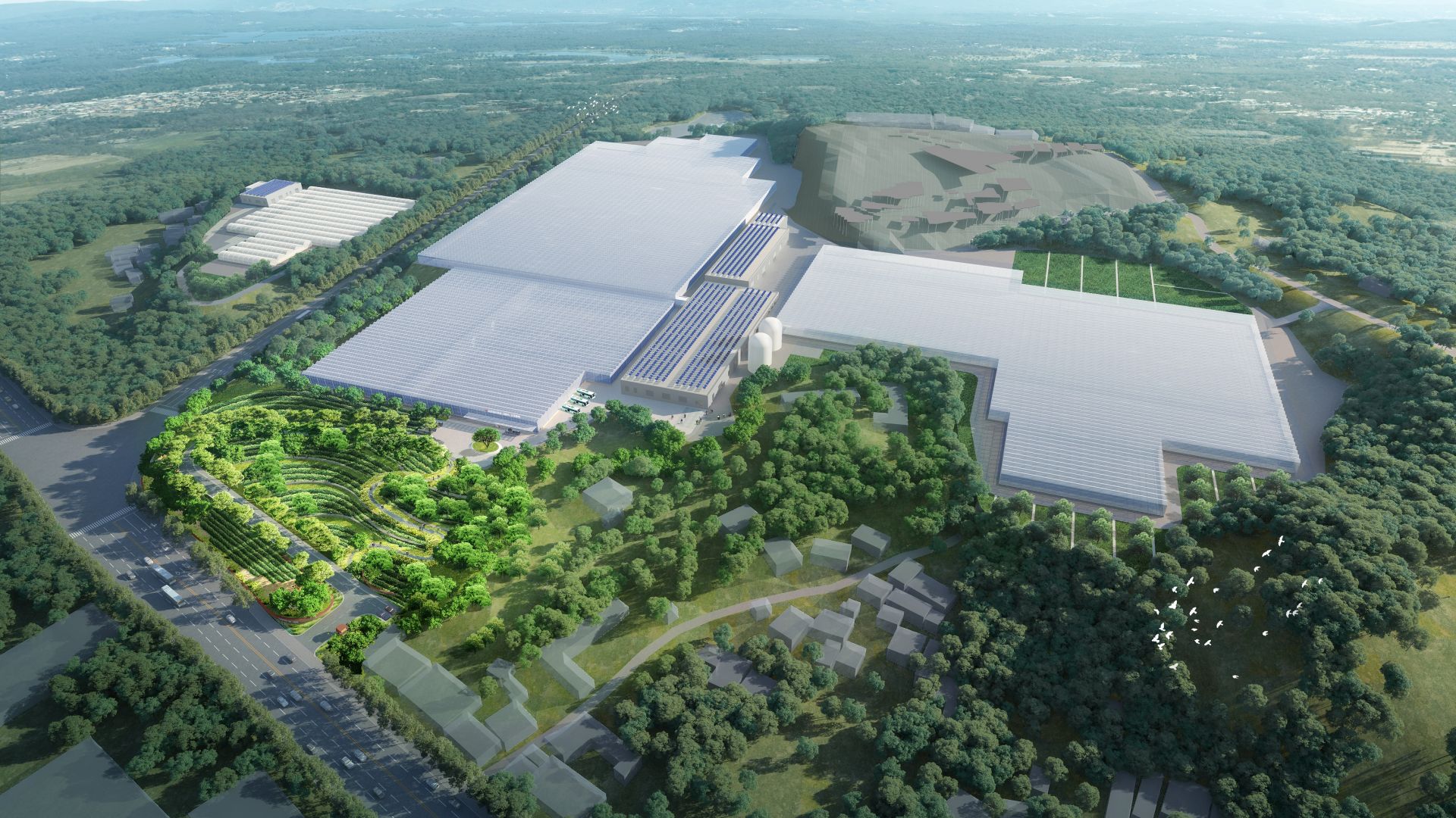 据了解,梅州市华发现代设施农业示范基地占地约324.3亩,建筑面积约11.6万平方米,总投资约4.6亿元,是华南地区规模最大的山地现代设施农业项目。项目规划2个半封闭玻璃温室、1个薄膜温室及附属设施用房,以种植串收番茄、草莓等高附加值经济作物为主,探索温室种植水稻、小麦等主粮,预计年产值可达7000万元。