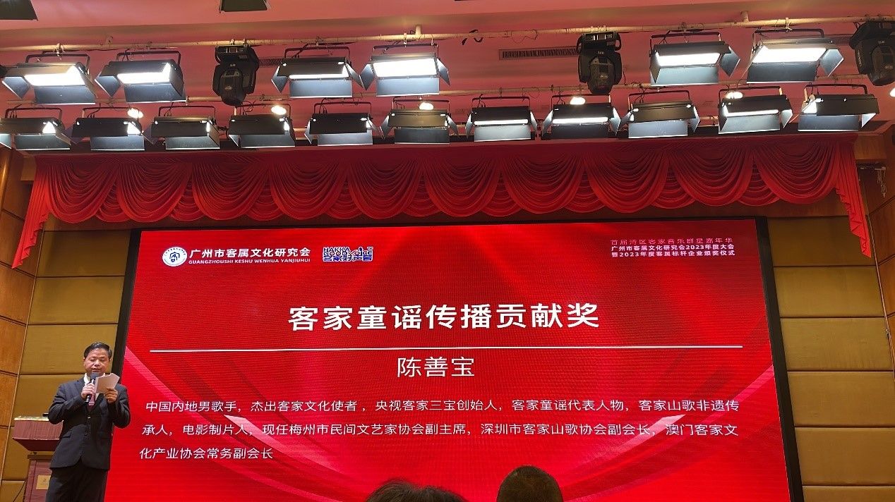 知名客家音乐人、央视客家三宝组合创始人陈善宝当选广州市客属文化研究会副会长。研究会为表彰陈善宝在2023年度积极推广、宣扬客家童谣的贡献及在大湾区各大城市推广的成效,授予其“客家童谣传播贡献奖”。