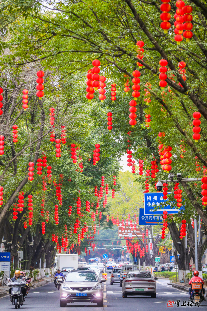 记者在梅江一二三路、客都大道、机场出口看到,一个个鲜艳的红灯笼串珠成链,整齐悬挂在道路两侧的树上,部分还写有“吉祥如意”“恭贺新禧”等祝福语,把春节美好的祝愿传递给每位市民群众,特别是让外出返乡的游子们感受归家的温馨感。