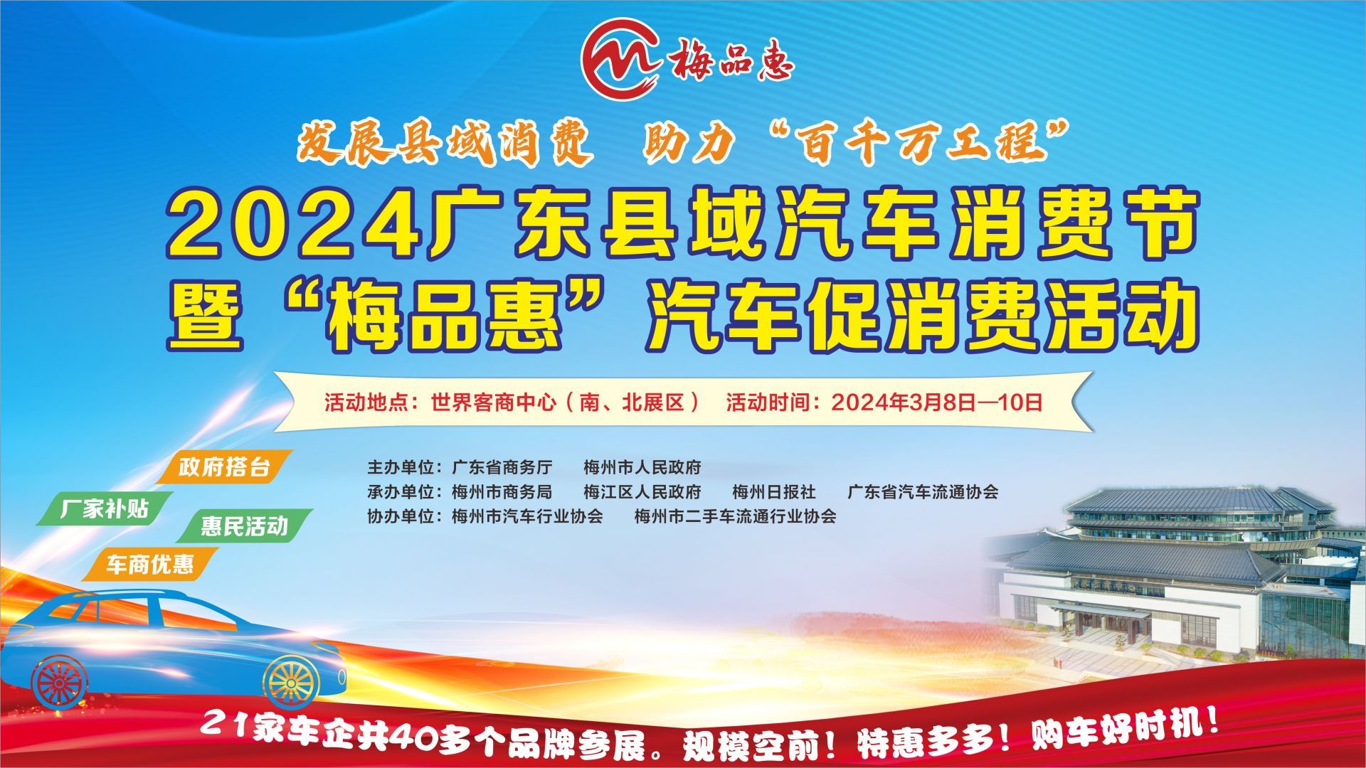 掌上梅州讯 发展县域消费,助力“百千万工程”。记者了解到,2024广东县域汽车消费节暨“梅品惠”汽车促消费活动将于3月8日至10日在世界客商中心举行。