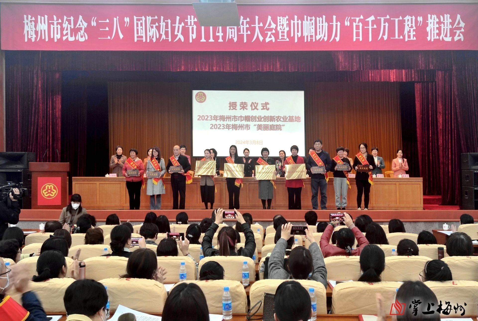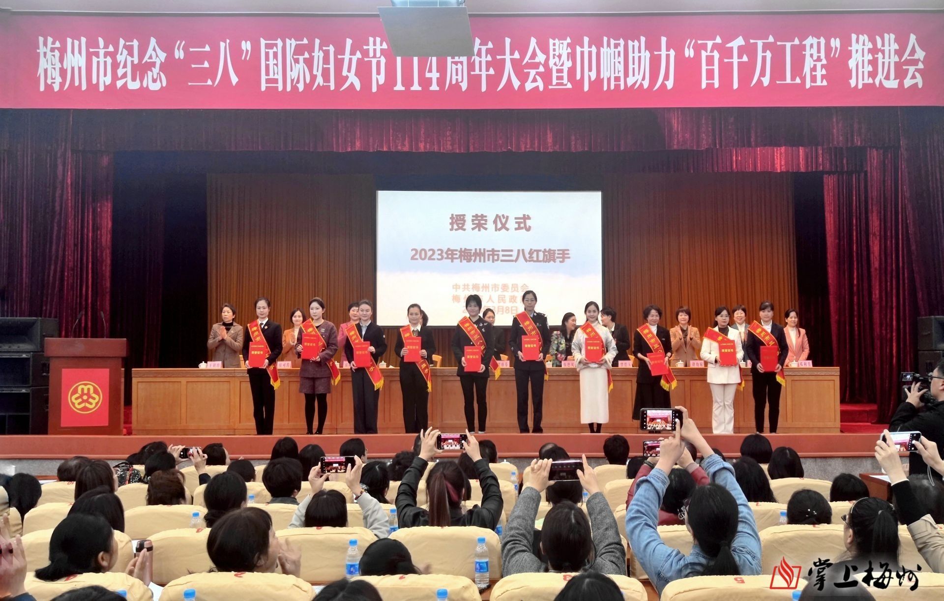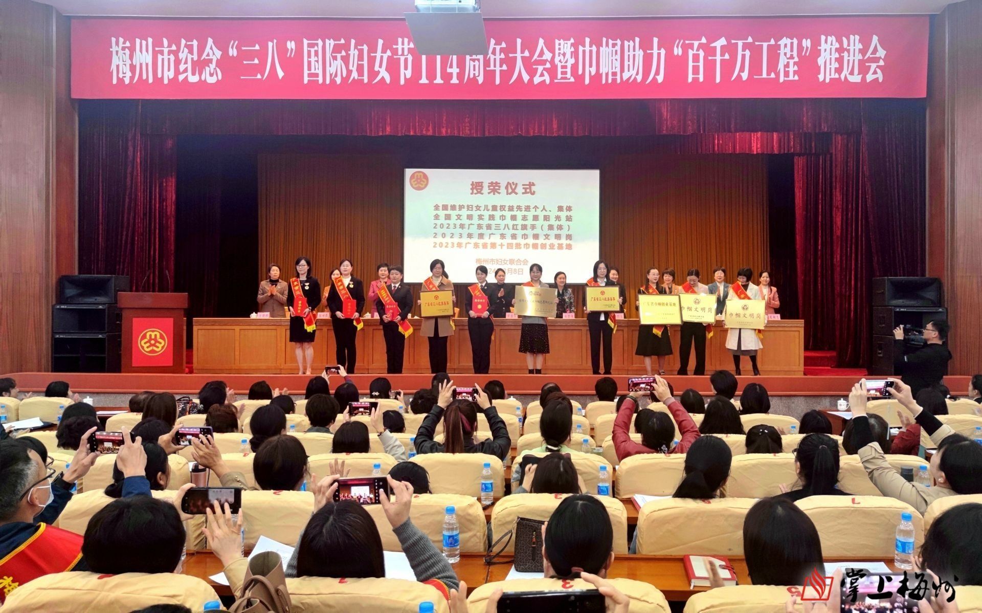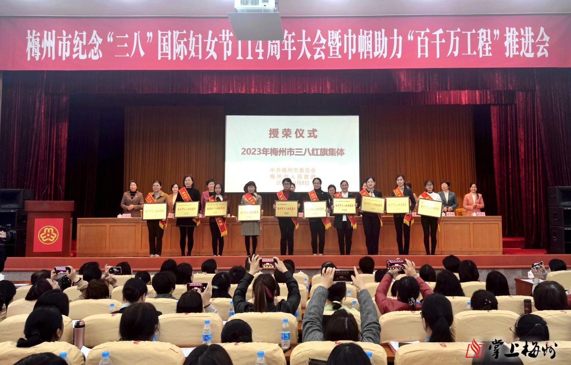 会议通报了受全国妇联、省妇联表彰的先进典型和2023年梅州市三八红旗手(集体)名单,宣读了由市妇联等选树的2023年度各类典型,并举行授荣仪式。会上还宣读了巾帼助力“百千万工程”倡议书,号召团结广大妇女围绕市委、市政府中心工作和省妇联工作部署,以主人翁姿态投身“百千万工程”,为推动梅州苏区加快振兴、共同富裕贡献智慧与力量。