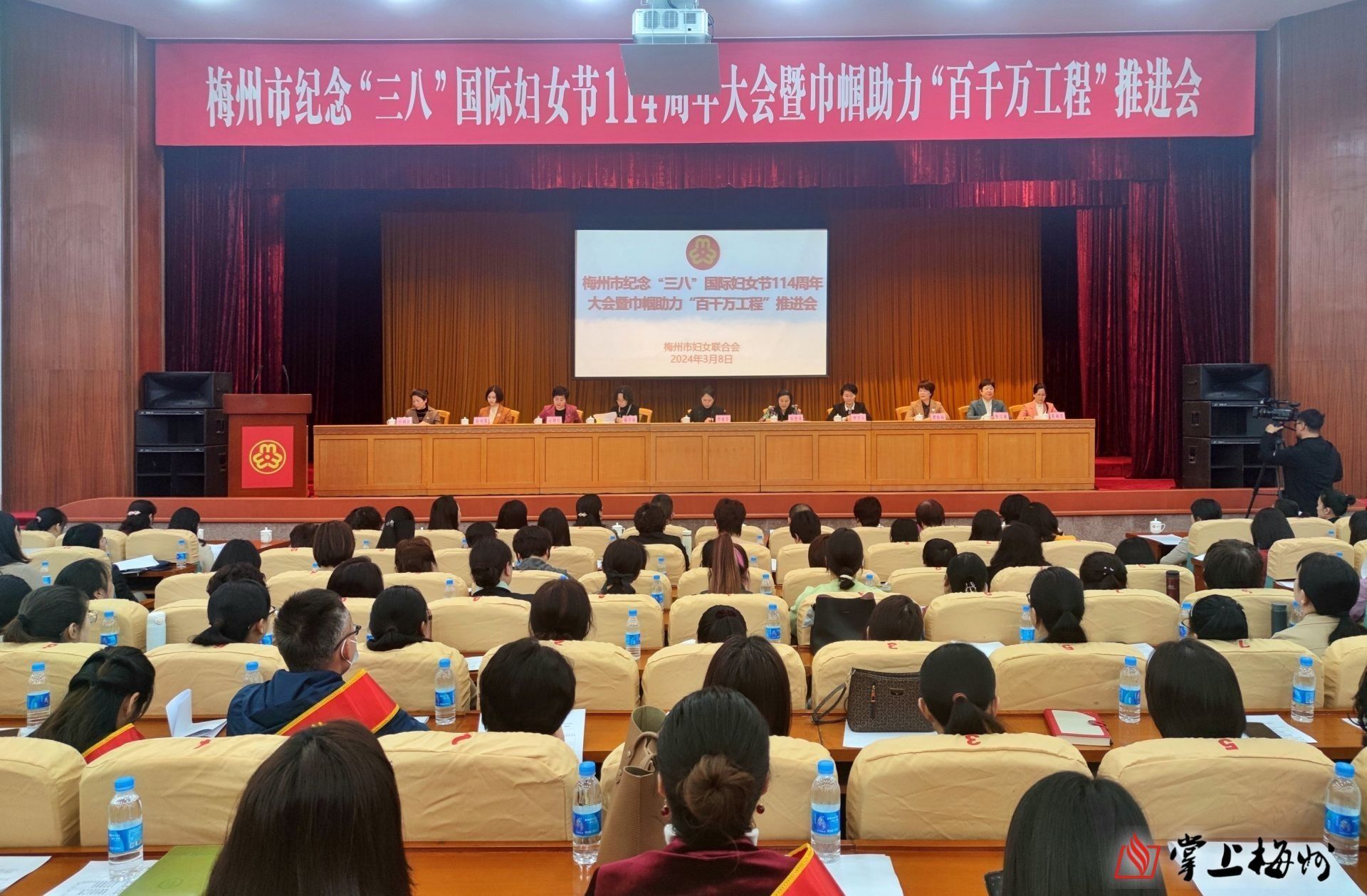 掌上梅州讯 3月8日下午,梅州市纪念“三八”国际妇女节114周年大会暨巾帼助力“百千万工程”推进会在市委礼堂召开。市委常委、组织部部长罗盛芬,市人大常委会副主任伍德凤,市政府副市长陈伶俐,市政协副主席曾碧玉参加会议。