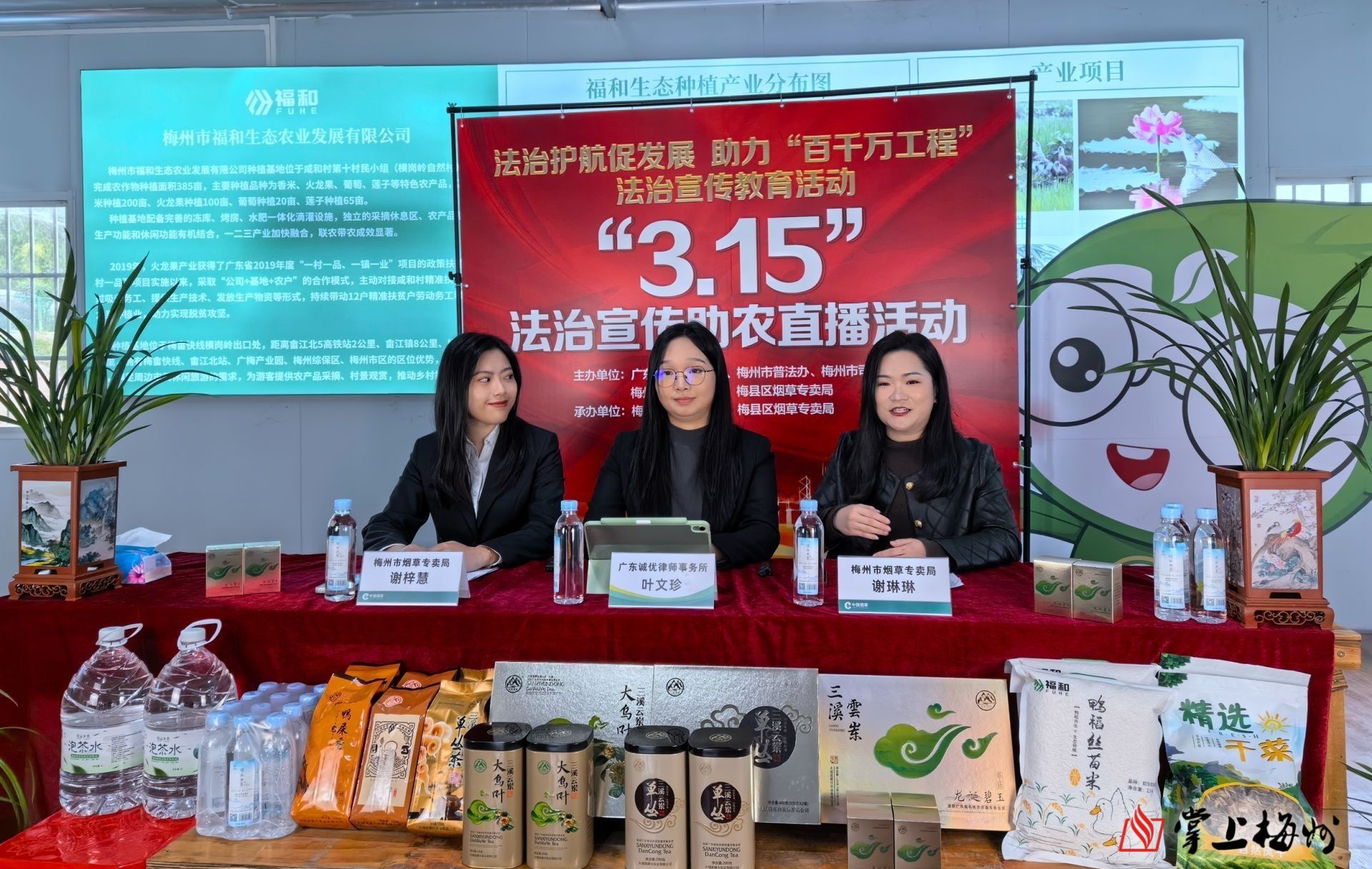 掌上梅州讯 3月15日上午,由广东省烟草专卖局、梅州市普法办、梅州市司法局、梅州市烟草专卖局、梅县区烟草专卖局联合主办的3·15“法治护航促发展 助力百千万工程”法治宣传助农直播活动在省“民主法治示范村”梅州市梅县区畲江镇咸和村进行。