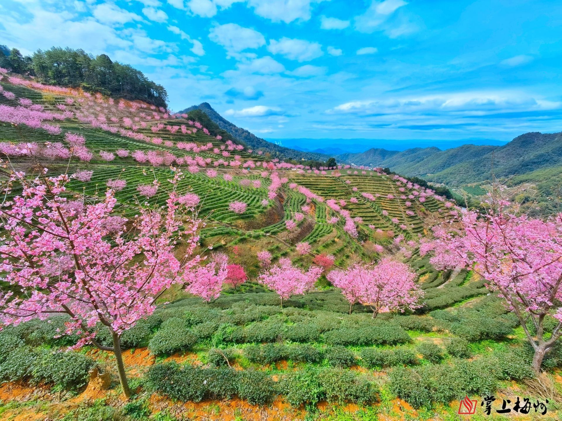 阴那山千亩茶田万株樱花吸引近10万名游客参观。