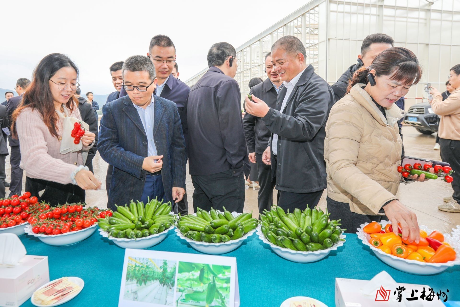 与会人员在华发现代设施农业示范基地项目品尝大棚果蔬。
