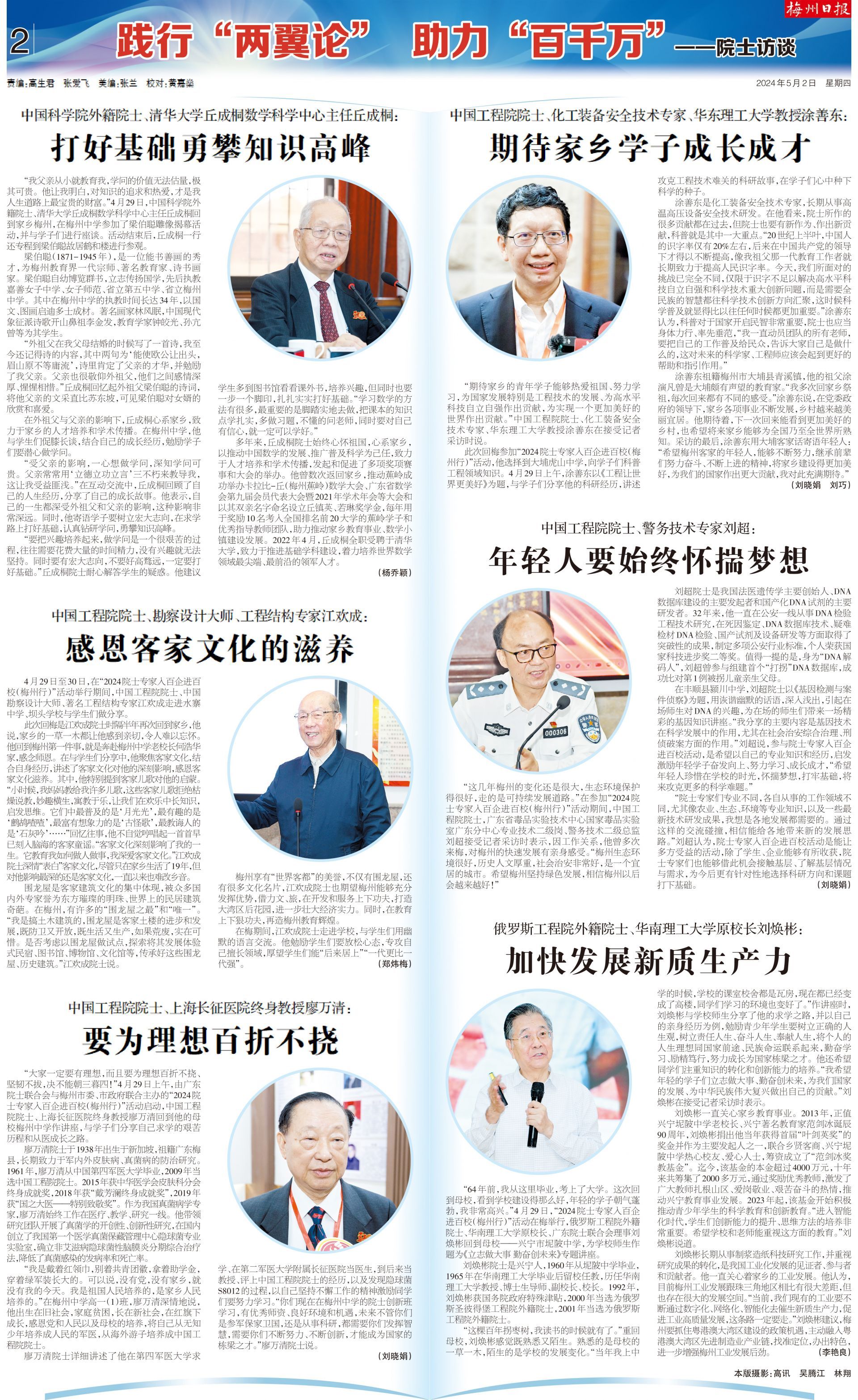 此次回梅参加“2024院士专家入百企进百校(梅州行)”活动,他选择到大埔虎山中学,向学子们科普工程领域知识。4月29日上午,涂善东以《工程让世界更美好》为题,与学子们分享他的科研经历,讲述攻克工程技术难关的科研故事,在学子们心中种下科学的种子。