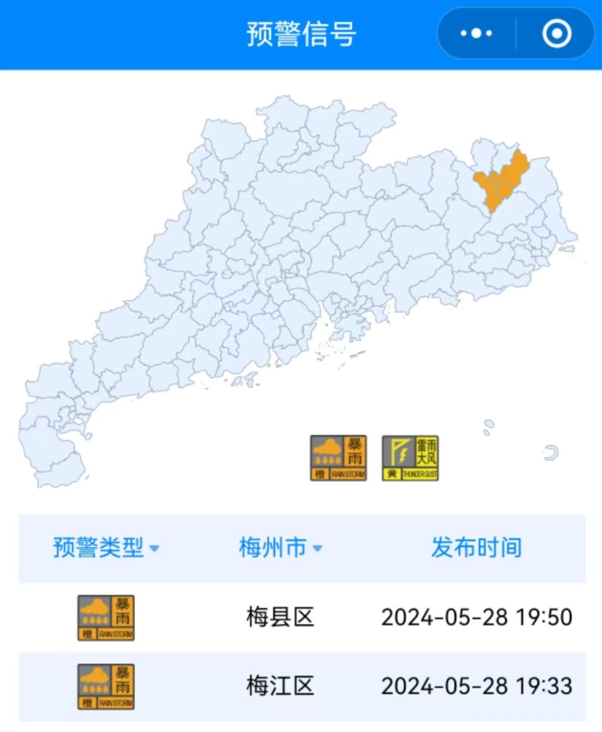 掌上梅州讯 记者从市气象局获悉,受强降水云团影响,梅江区、梅县区程江镇已出现明显降水,预计降水将持续,梅州市气象台28日19时33分发布了暴雨橙色预警信号,梅县区气象台于2024年05月28日19时50分发布梅县区新城街道、南口镇、程江镇暴雨橙色预警信号。