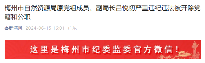 日前,经梅州市委批准,梅州市纪委监委对梅州市自然资源局原党组成员、副局长吕悦初严重违纪违法问题进行了立案审查调查。