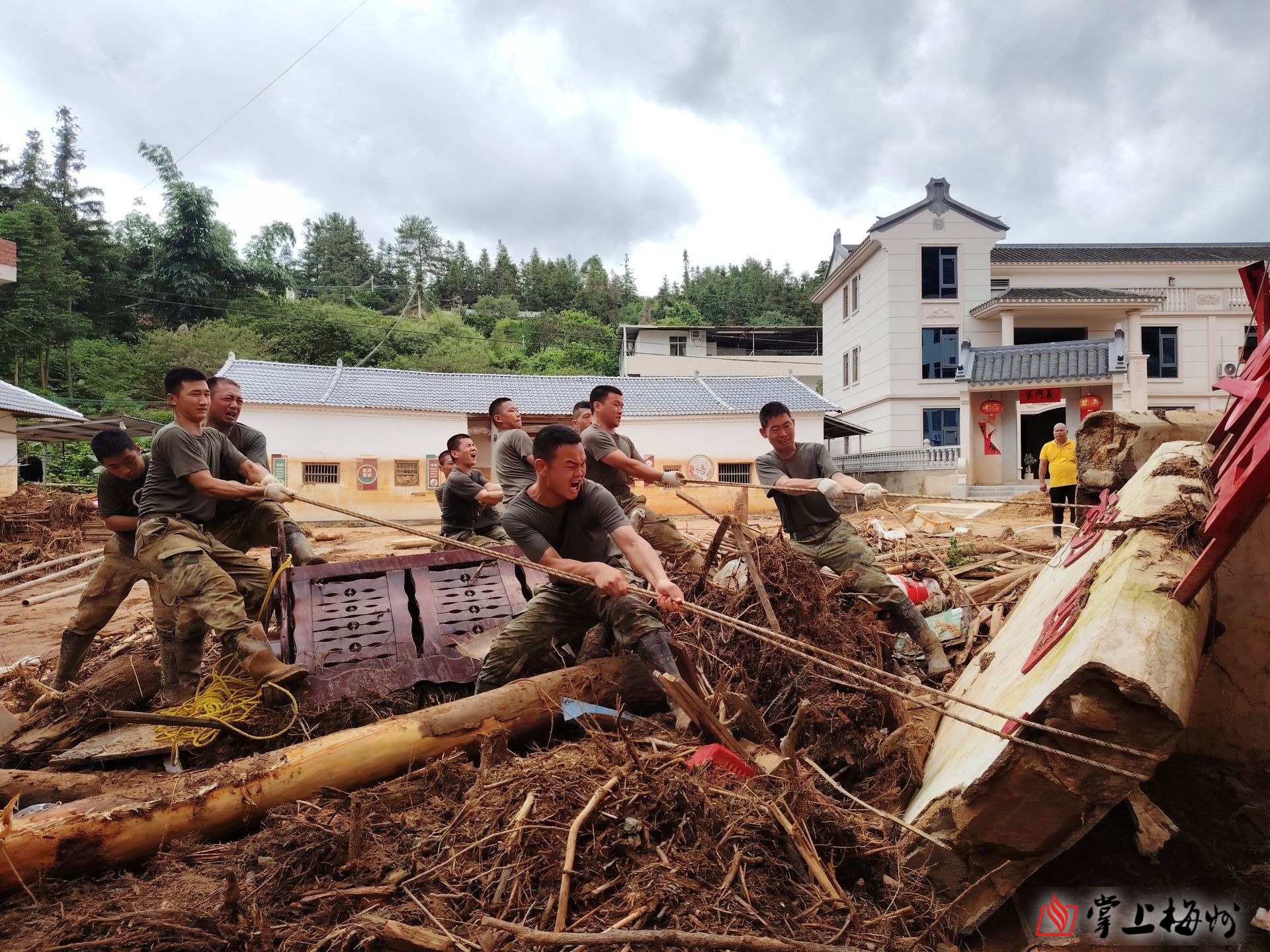 救援官兵在平远县泗水镇开展房屋清淤排危、道路清障抢通等工作。(受访者 供图)