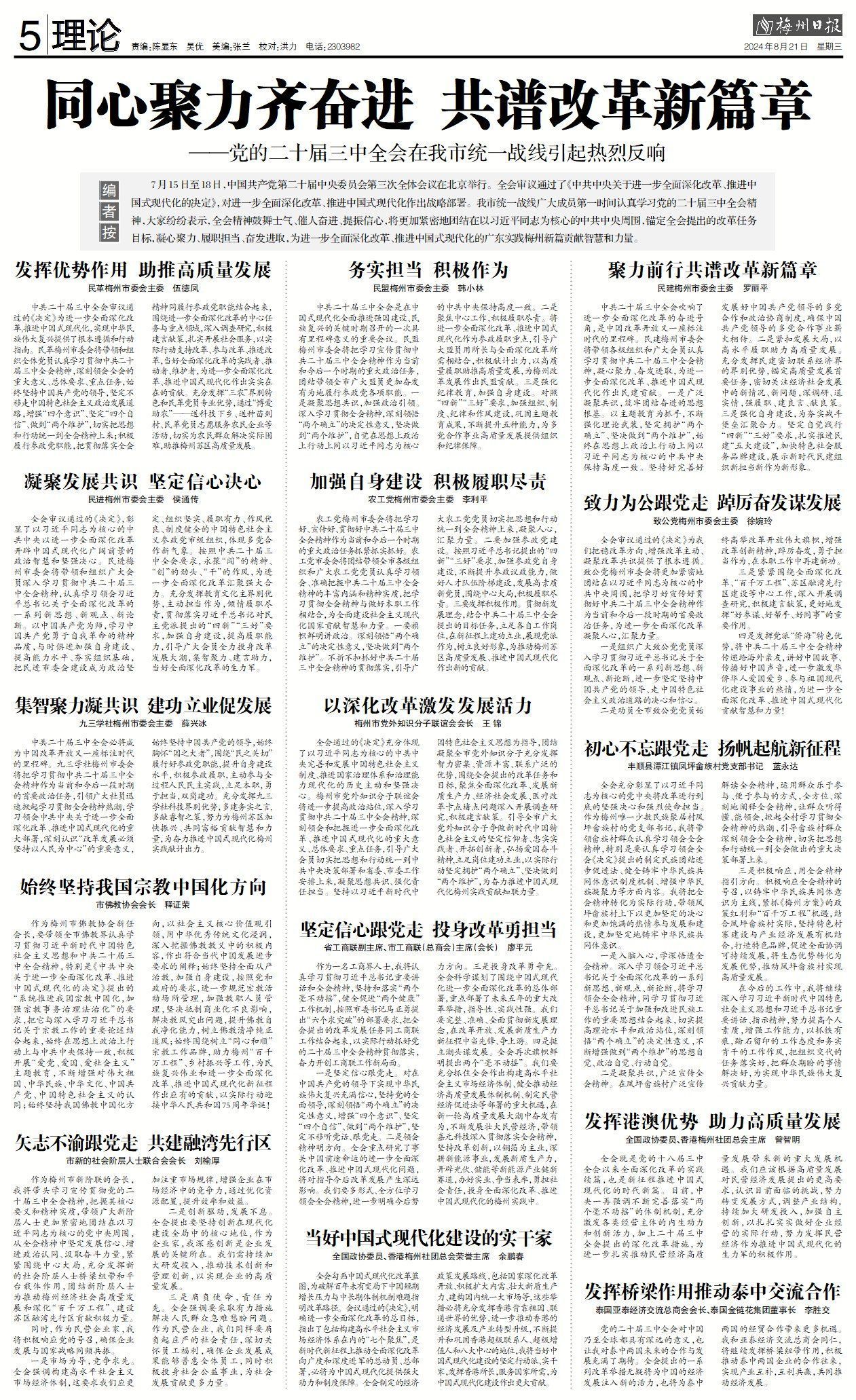 全会审议通过的《决定》为我们把稳改革方向、增强改革主动、凝聚改革共识提供了根本遵循。致公党梅州市委会将更加紧密地团结在以习近平同志为核心的中共中央周围,把学习好宣传好贯彻好中共二十届三中全会精神作为当前和今后一段时期的首要政治任务,为进一步全面深化改革凝聚人心,汇聚力量。