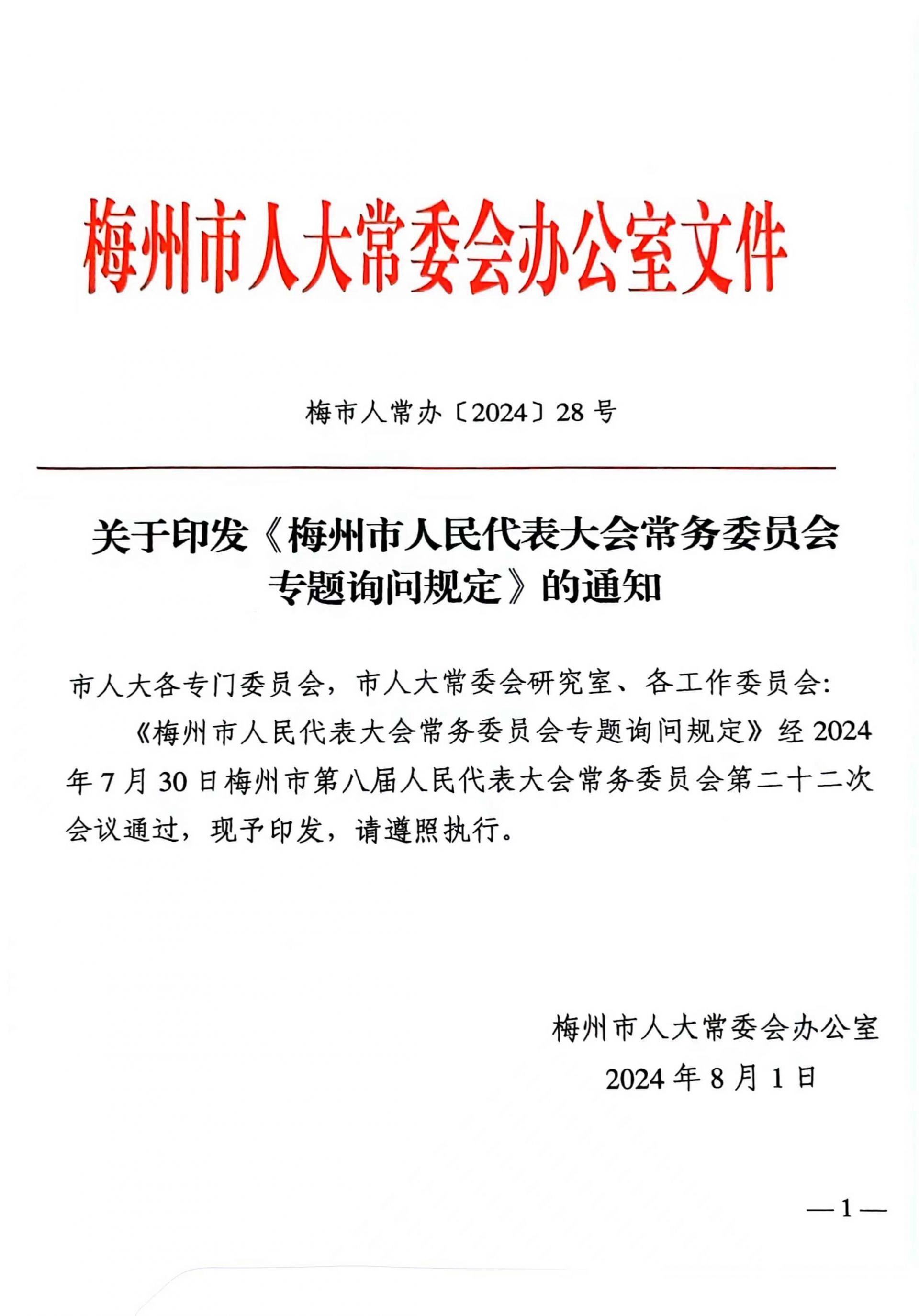 为保障和规范依法开展询问工作,增强人大监督的针对性和实效性,市人大常委会对标对表上级人大要求,学习借鉴外地先进经验,认真研究制定专题询问办法。在市八届人大常委会第二十二次会议上,审议并通过了《梅州市人民代表大会常务委员会专题询问规定》。
