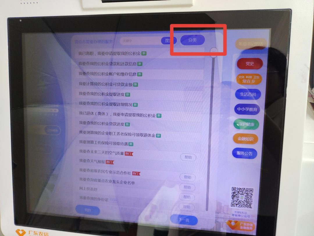 通过刷脸或刷身份证进入查询界面,点击“分类”。