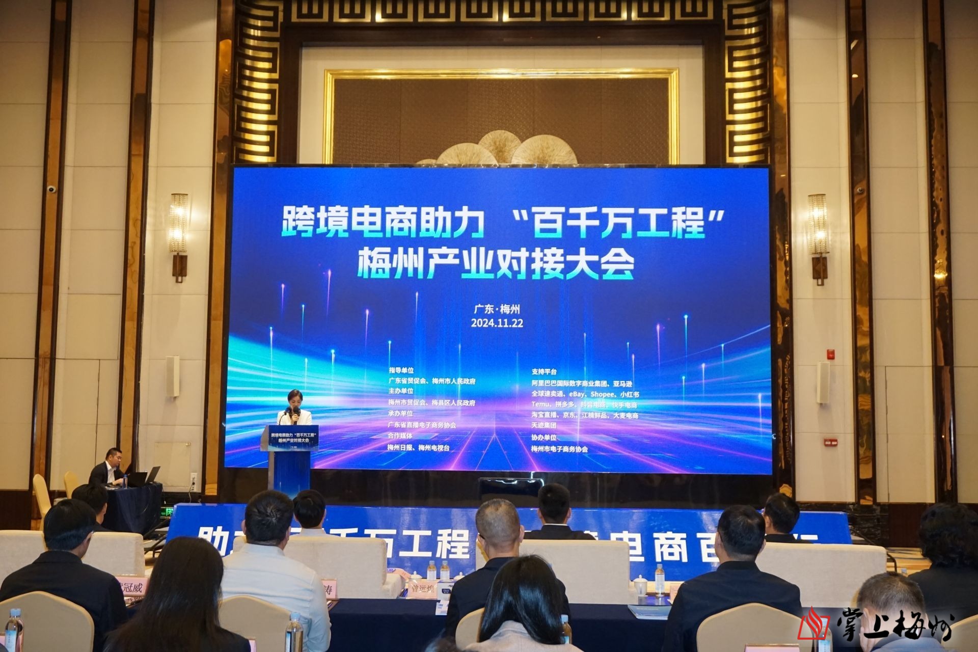 掌上梅州讯 11月22日上午,跨境电商助力“百千万工程”梅州产业对接大会在梅城举办。广东省贸促会、梅州市政府、市直有关单位和各县(市、区)等相关负责同志,相关领域专家学者、跨境电商平台代表及有关商(协)会、生态服务机构、重点对接企业代表,梅州市企业代表等近百人参加。
