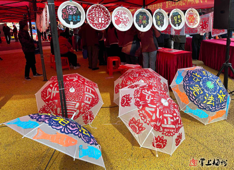 在梅江区主题宣传活动现场,普法志愿者以剪纸、书法、雕版印刷等艺术形式生动形象地传递宪法精神,并向群众发放以法治内容为主的非遗客家剪纸、书签、彩书等纪念品;而在兴宁市,版画制作被运用到宪法宣传当中,群众在学习制作版画时增进对宪法的理解。