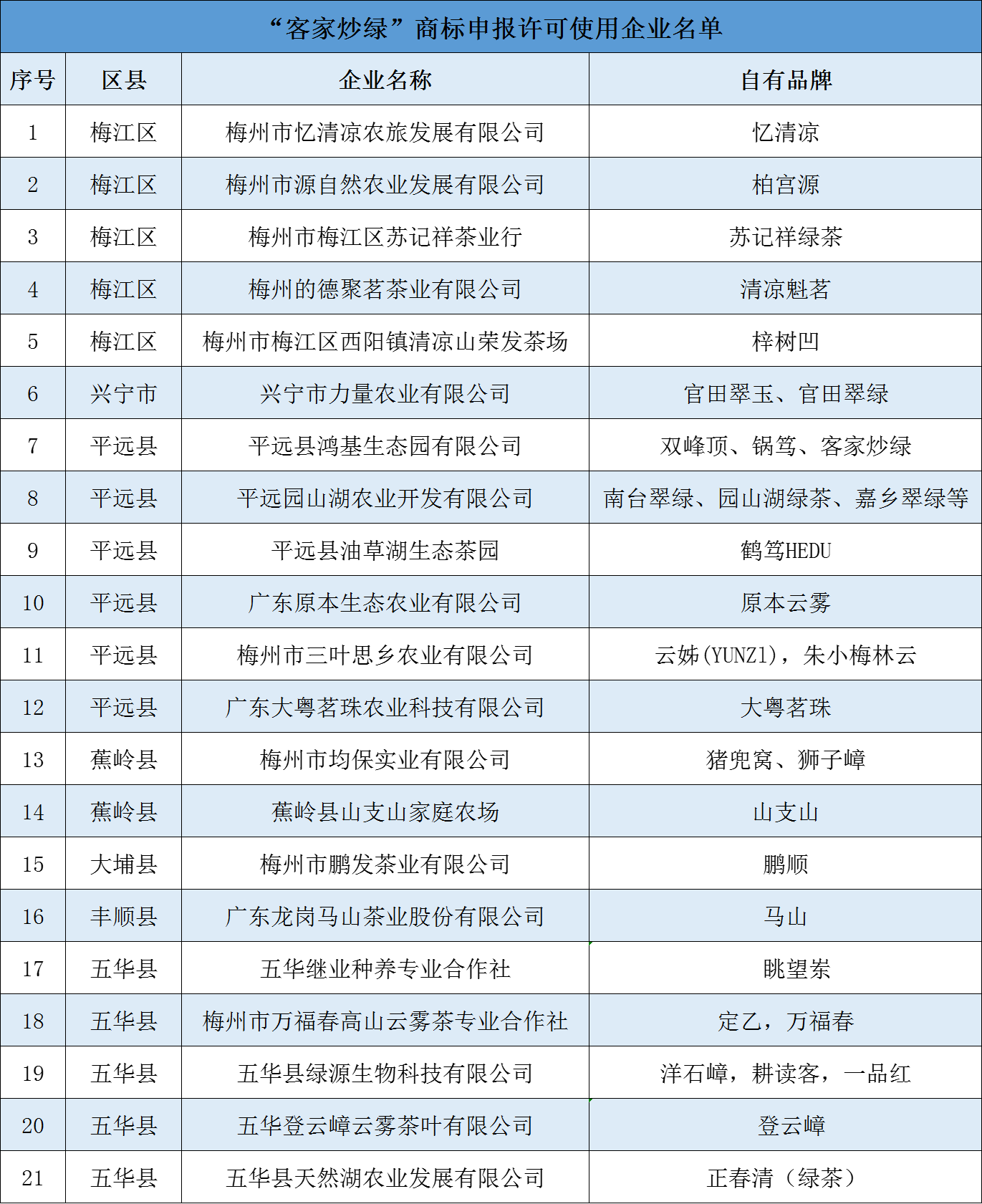 市委、市政府高度重视梅州茶产业高质量发展工作,结合梅州茶产业实际,提出了打造“客家炒绿”品牌、推动梅州茶产业高质量发展的工作思路。为规范“客家炒绿”的生产、经营,更好地推动我市茶产业发展,市农林科学院积极推动“客家炒绿”商标管理工作,制定《“客家炒绿”商标使用管理规定》,开展商标授权许可工作。2023年11月,“客家炒绿”通过国家版权局登记保护,《客家炒绿商标使用管理办法》正式印发实施。2024年8月,市农业农村局和市农林科学院联合发出《关于开展“客家炒绿”商标许可使用申请工作的通知》,全市茶叶生产经营者可根据通知要求,申请使用“客家炒绿”商标。经过精心组织,我市首批“客家炒绿”商标申报获得许可使用的茶叶企业名单出炉。