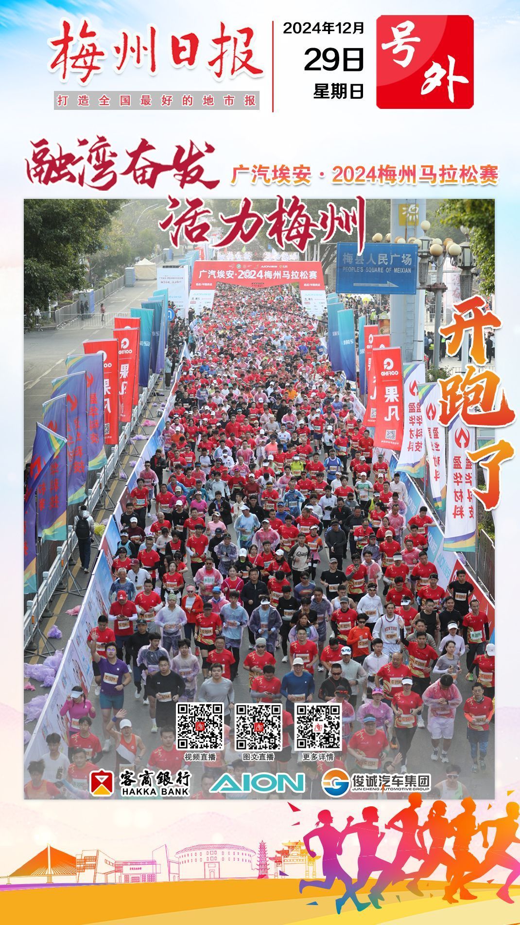 掌上梅州讯 12月29日早上7点30分,以“融湾奋发 活力梅州”为主题的广汽埃安·2024梅州马拉松赛在梅县区人民广场鸣枪开跑。来自全球5个国家和港澳台地区约1.9万名选手齐聚梅州,迎着朝阳、奋勇向前,在这座“魅力满满”的城市迈出活力满满的步伐。