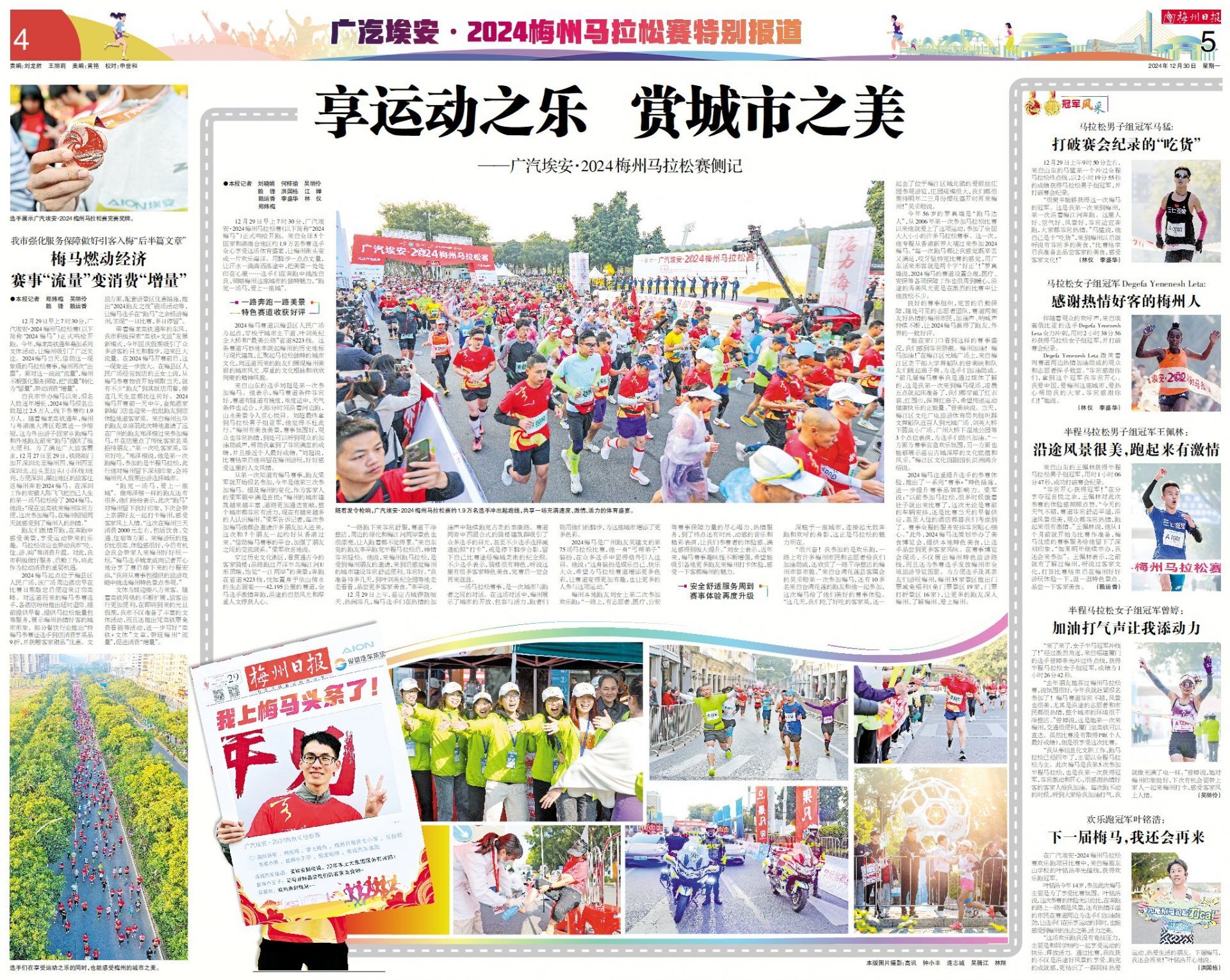 12月29日早上7时30分,广汽埃安·2024梅州马拉松赛(以下简称“2024梅马”)正式鸣枪开跑。来自全球5个国家和港澳台地区约1.9万名参赛选手全心享受这场体育盛宴,让梅州街头变成一片欢乐海洋。用脚步一点点丈量,让汗水一滴滴洒落途中,把美景一处处印在心里……选手们在奔跑中挑战自我,领略梅州这座城市的独特魅力,“跑完一场马,爱上一座城”。