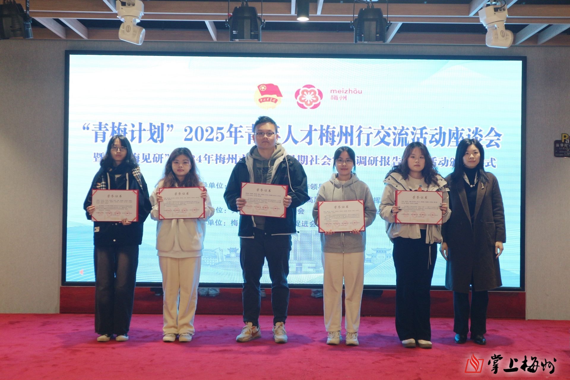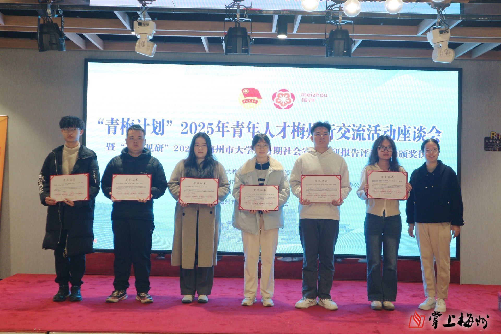 活动还举行“青梅计划”2025年青年人才梅州行交流座谈会暨“青梅见研”2024年梅州市大学生暑期社会实践调研报告评选活动颁奖仪式,座谈会上,团市委相关负责人向来自各高校的青年人才表示欢迎,并介绍了梅州的整体情况及人才政策,邀请大家深入走进梅州、了解梅州、扎根梅州,参与到推动梅州振兴发展事业中来。座谈会上还为“青梅见研”2024年梅州市大学生暑期社会实践调研报告评选活动获奖代表颁奖,获奖代表依次分享调研成果;邀请青年人才围绕推动苏区融湾先行区建设、发展实体经济、助力乡村振兴和人才政策等主题各抒己见、畅所欲言。