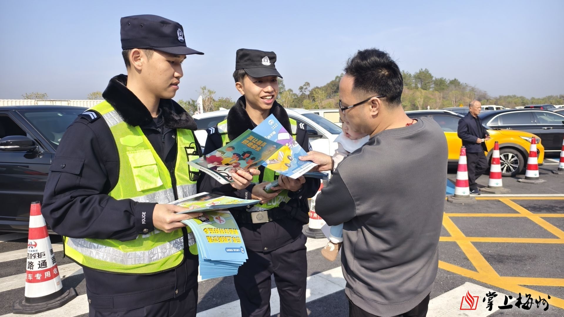 执勤民警给进入到服务区的返乡司乘人员派发交通安全宣传手册。