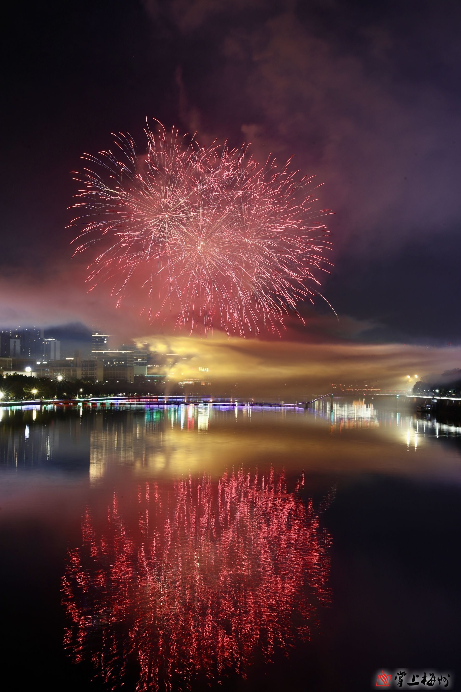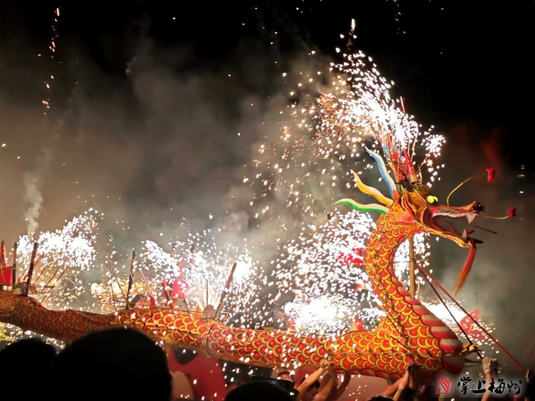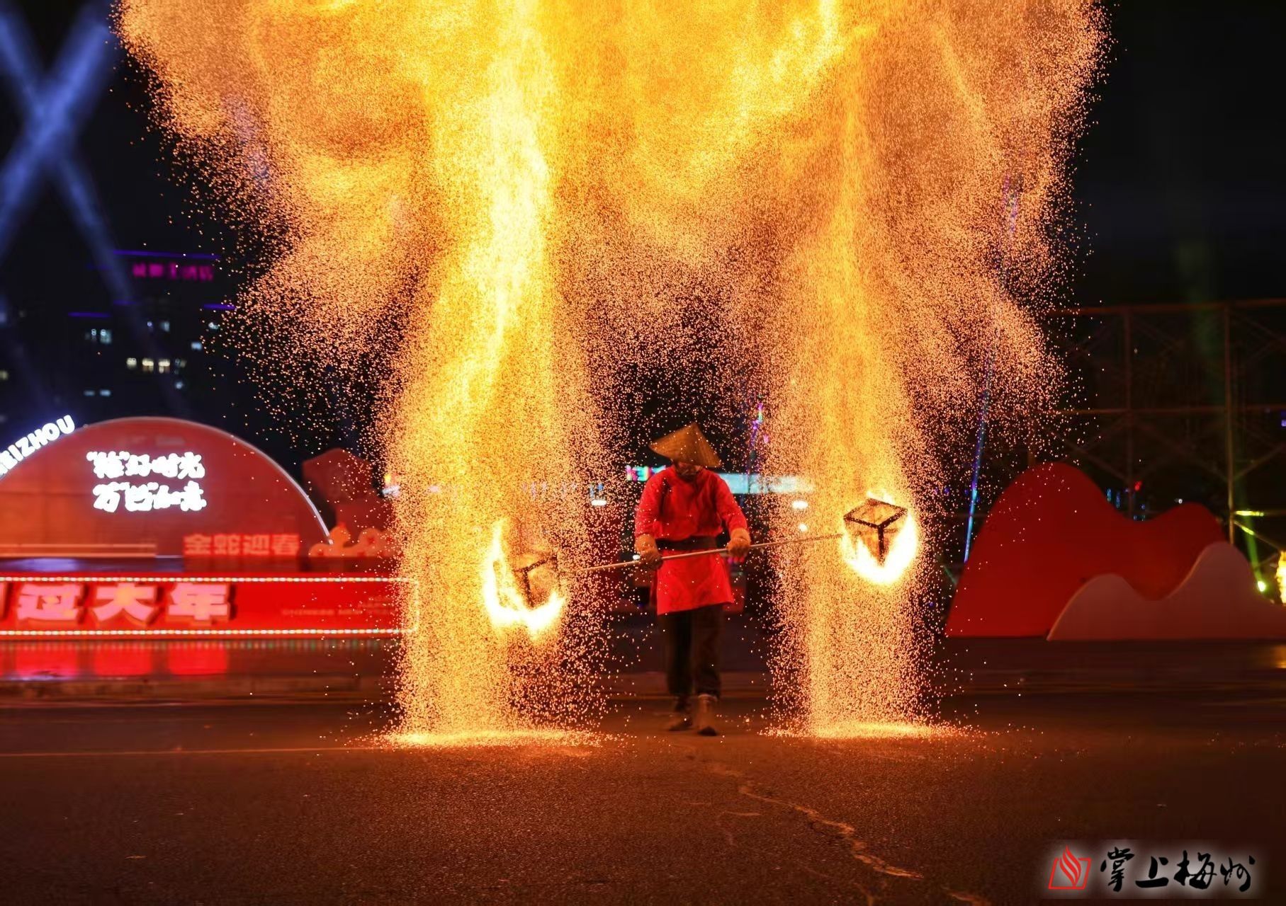 现场开展了歌舞互动秀、大型音乐灯光秀和“火壶除邪”“火龙迎福”“铁花浪漫”“烟花璀璨”等国家级非遗表演。伴随着欢快的音乐,技艺高超的表演者们在夜色中舞动火刀、火棍、火轮、火壶,打铁花、烧火龙等节目依次上演,一道道火光在空中划出绚丽的弧线,犹如繁星倾泻而下,为观众带来了一场视觉与感官的双重盛宴。
