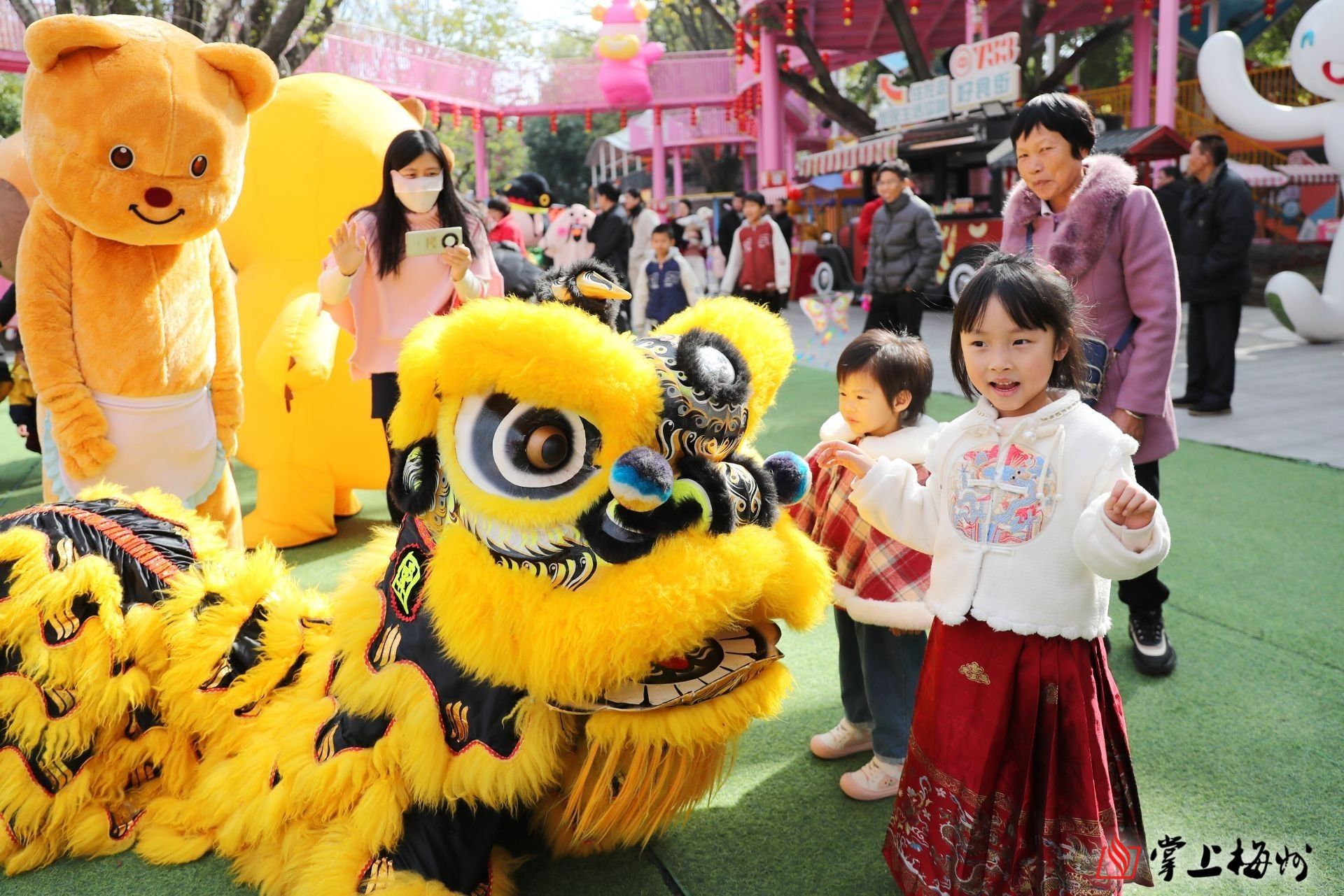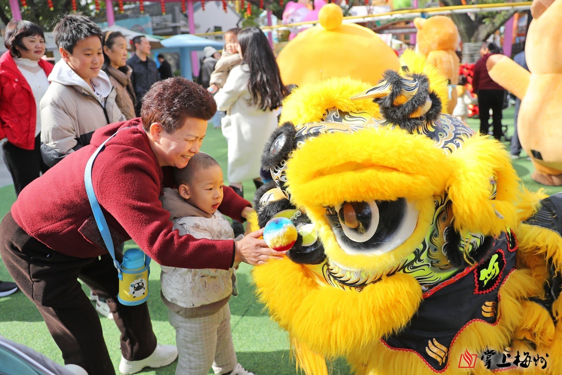 梅城嘉印拾光乐园里,大人小孩纷纷和俏皮可爱的舞狮合影。