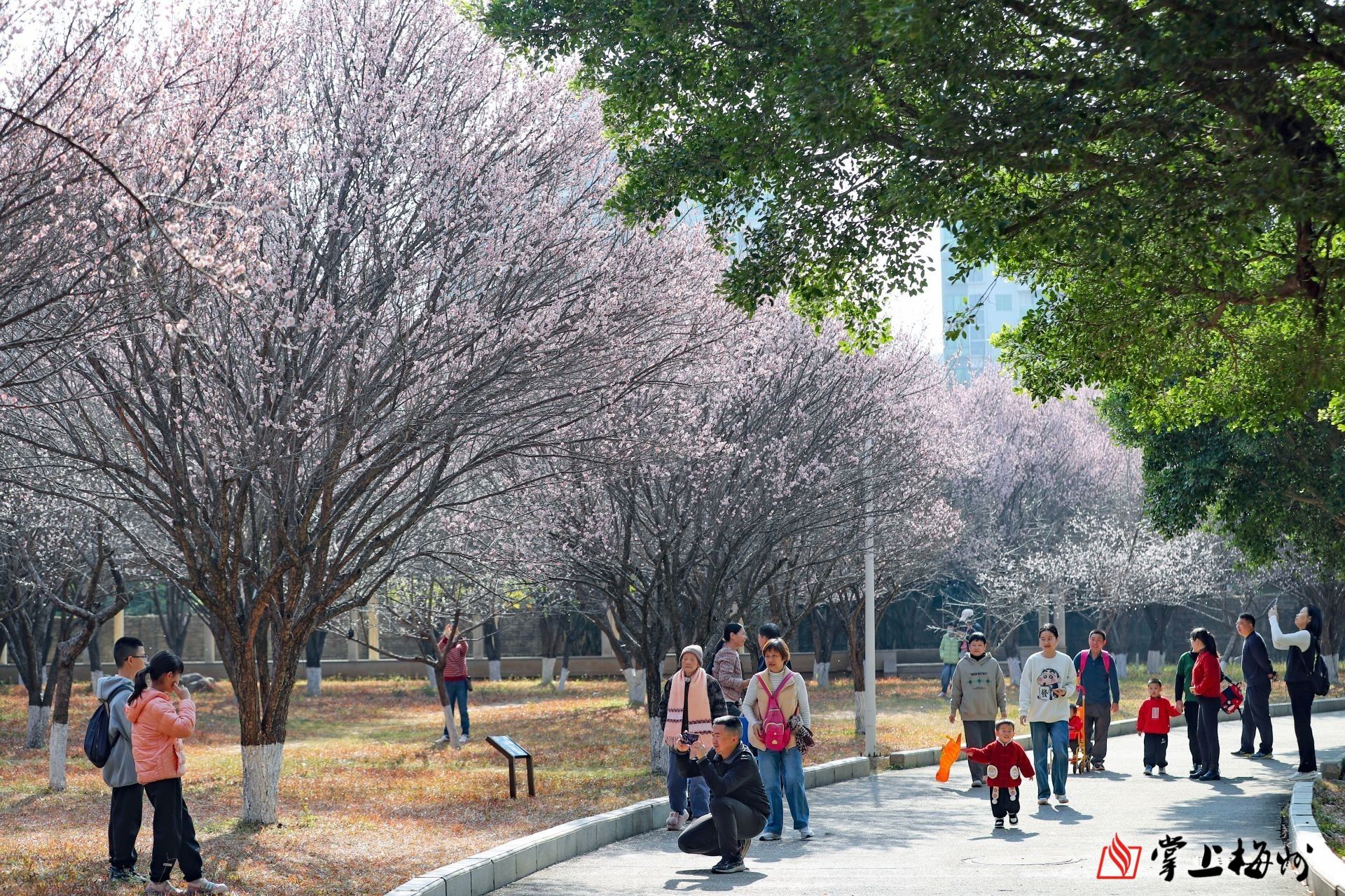 “梅”开眼笑喜上梢。梅城客家公园里,朵朵梅花挤满枝头,竞相绽放。微风轻拂,花瓣如雨般飘落,为这片梅林增添了几分浪漫与诗意。如此“梅”景早已传遍“朋友圈”,许多市民游客扶老携幼前来观赏拍照,他们互相指导着拍照动作,把新春的美好记录在属于他们的镜头里。