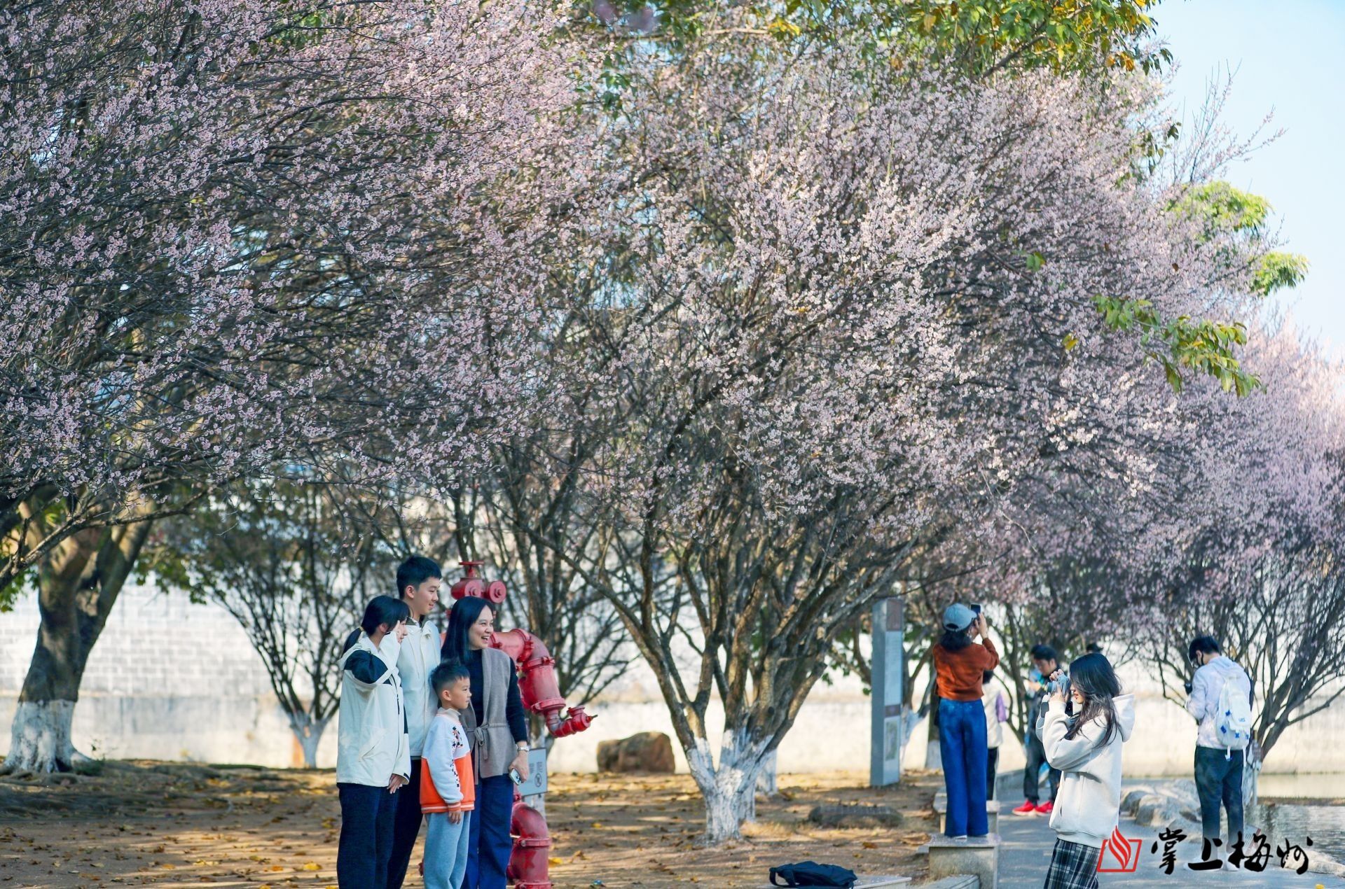 梅城客家公园内梅花热烈盛开,游客纷纷在花间留影。