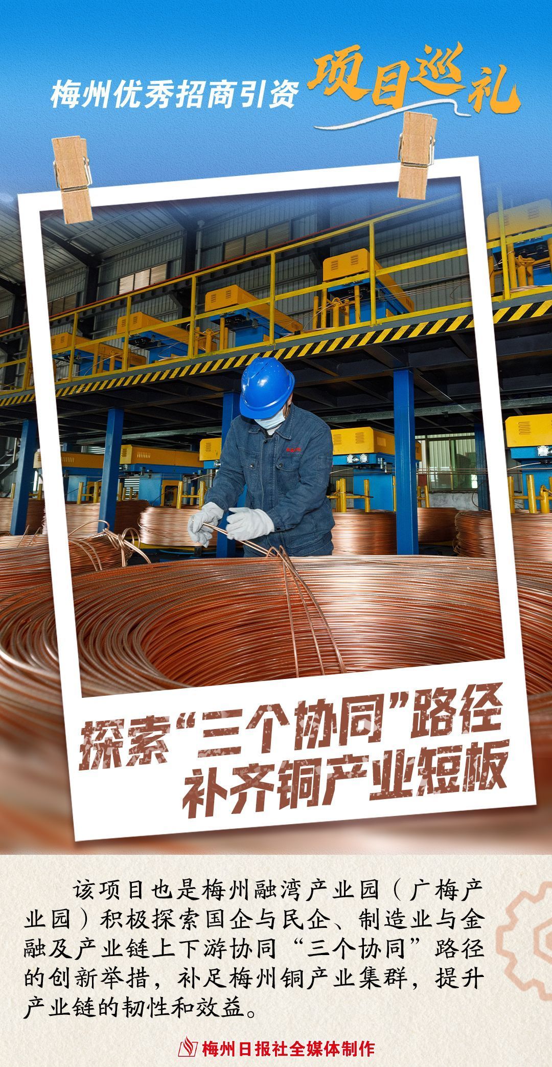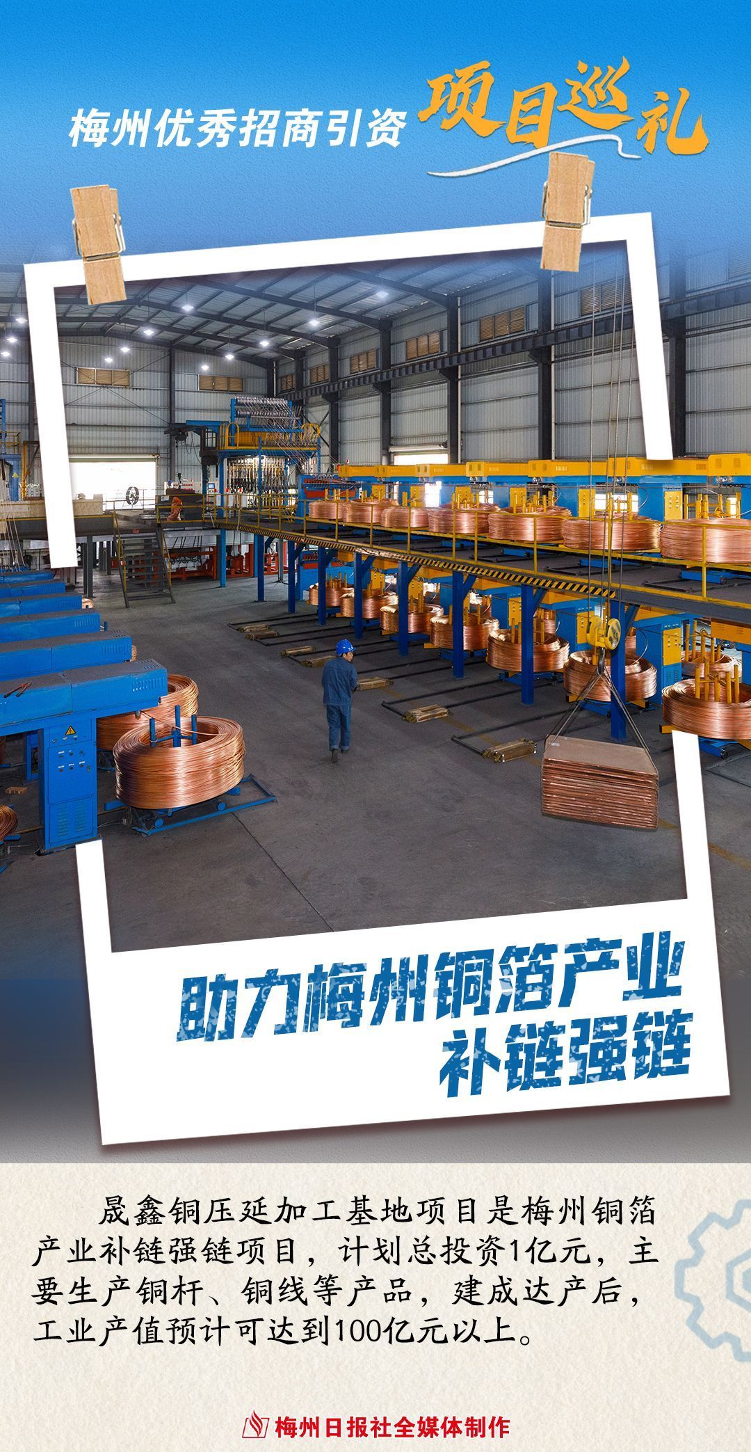 梅州是著名的铜箔之乡,拥有嘉元科技、盈华电子、龙宇覆铜板等一批铜行业领军型企业。为补足梅州铜产业集群短板、完善产业链,2024年,在市委、市政府的引导下,广梅指挥部在梅州融湾产业园(广梅产业园)引进铜杆(铜线)制造企业——晟鑫公司,通过租赁厂房建设晟鑫铜压延加工基地,向我市铜产业下游企业供应铜杆成品。