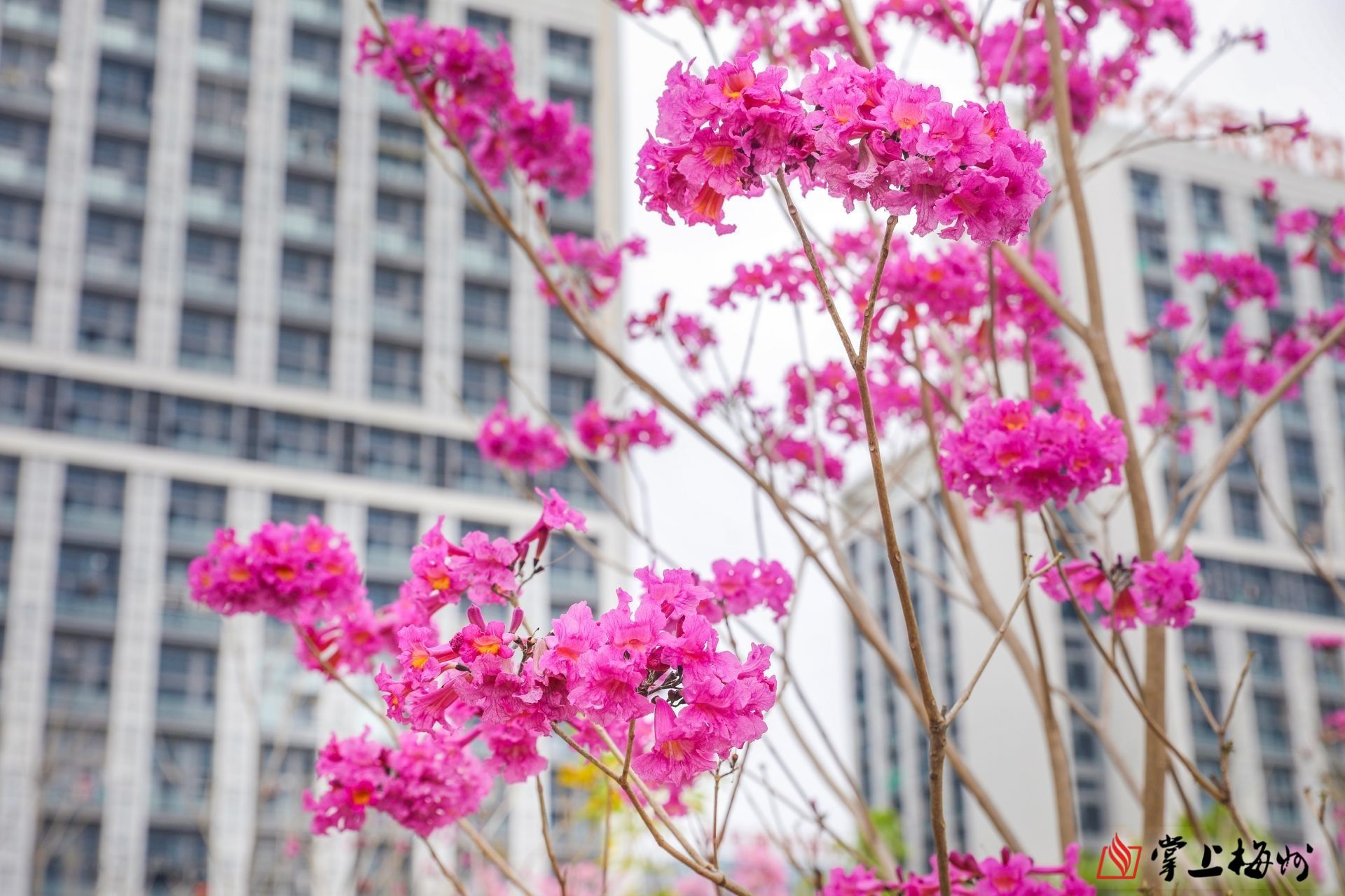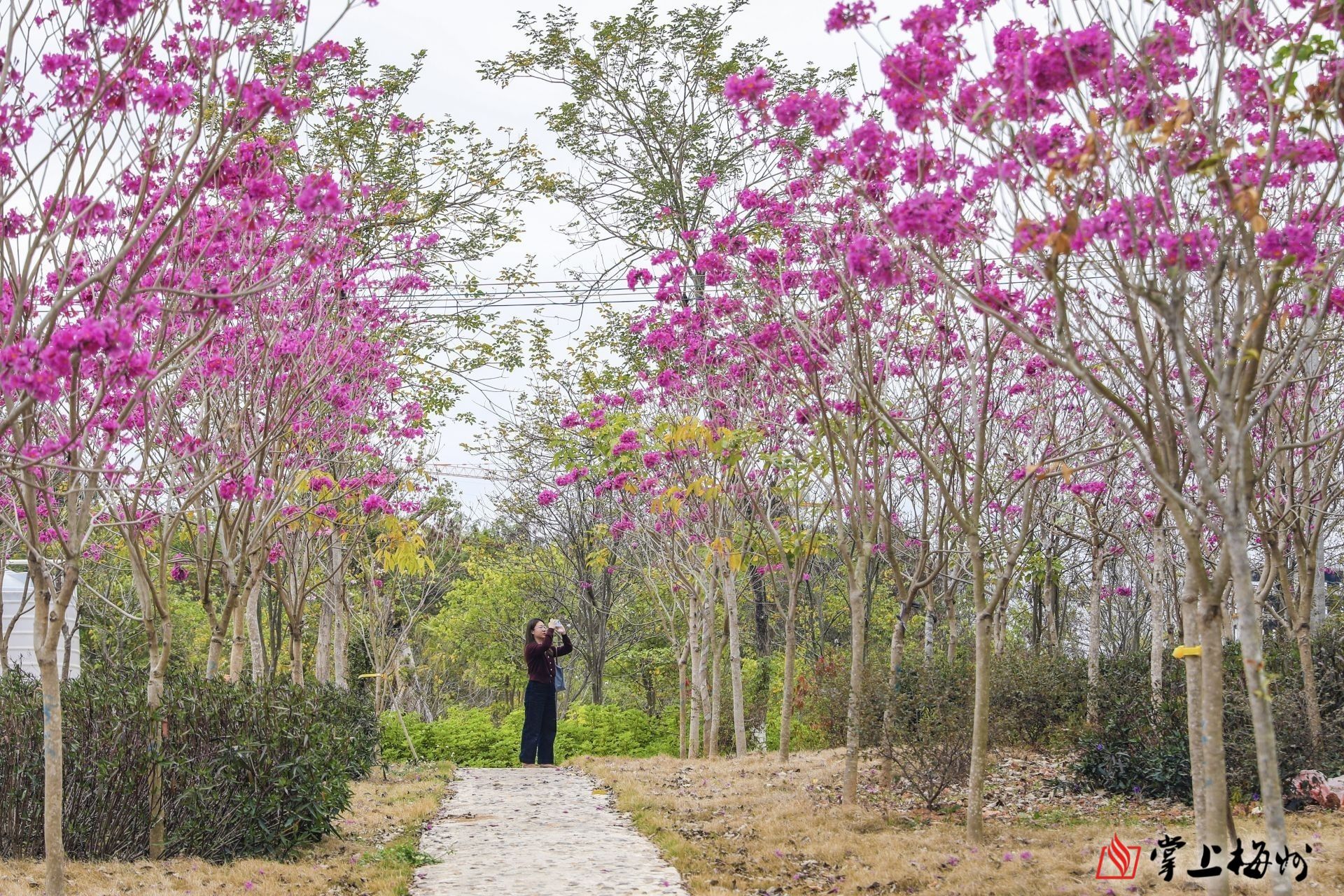 近日,在梅城绿轴花园“同心林”,去年栽下的紫花风铃木争相怒放,一团团粉紫色的花球开满枝头。远看花球璀璨,如烟如霞,近观花团锦簇,娇俏玲珑,春天的气息扑面而来,不少市民和游客驻足欣赏,大家纷纷拿出手机或相机拍照留念,捕捉每一个美丽瞬间。