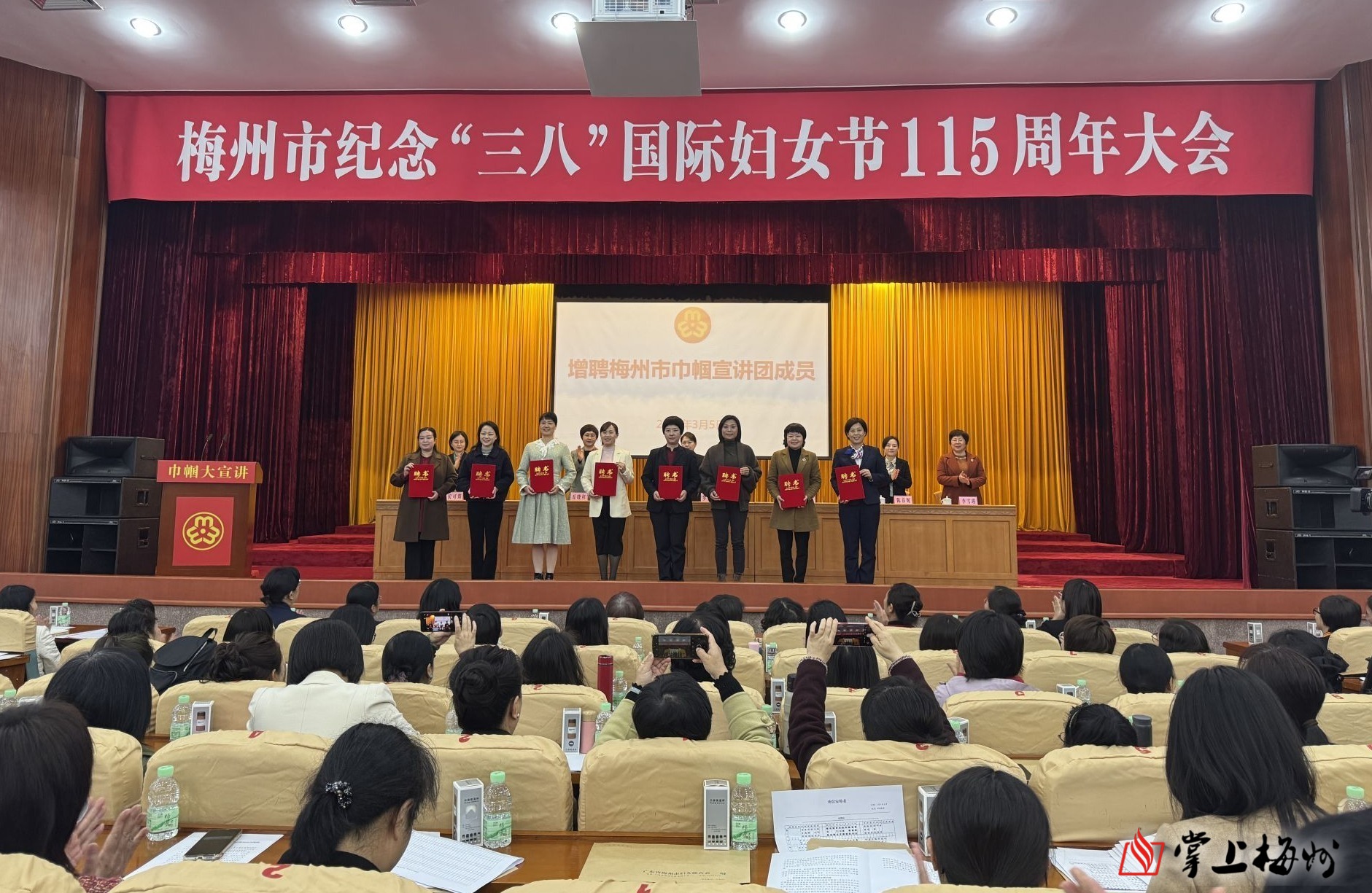 会议上通报受全国妇联表彰的先进典型并进行授荣,增聘梅州市巾帼宣讲团成员并举行广东妇女十四大精神宣讲。