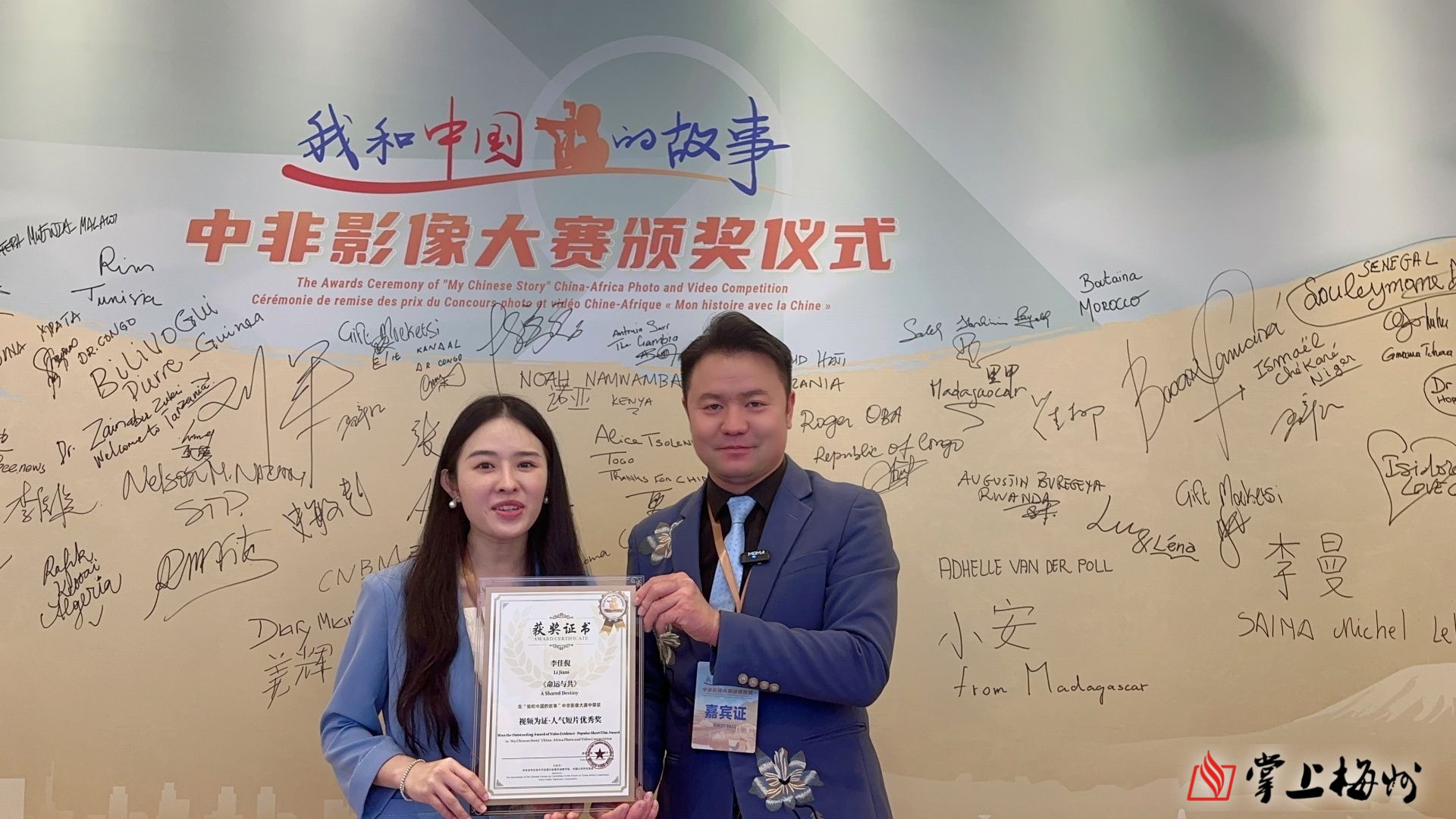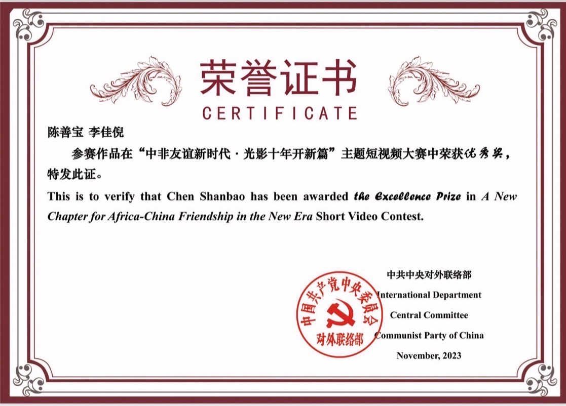 掌上梅州讯 近日,由中共中央对外联络部主办的“中非友谊新时代·光影十年新开篇”主题征文和短视频大赛颁奖仪式举行。由正高级音乐工程师、客家三宝组合创始人陈善宝与青年歌手李佳倪共同创作的音乐作品《命运与共》(中毛友谊之歌)在征集活动中脱颖而出,荣获优秀奖。