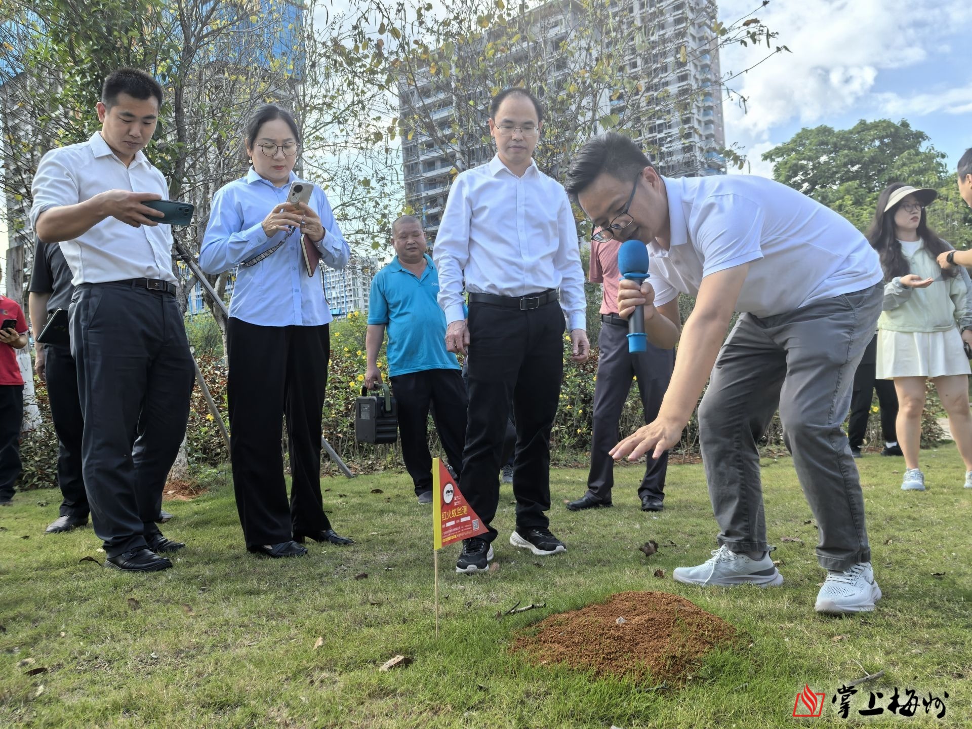 会上,市农林科学院植保专家作红火蚁防控技术、个人防护与应急处理专题培训。随后,与会人员前往梅州城区绿轴花园广场防控现场,实地观摩红火蚁蚁巢识别方法、红火蚁防控用药实操演练。