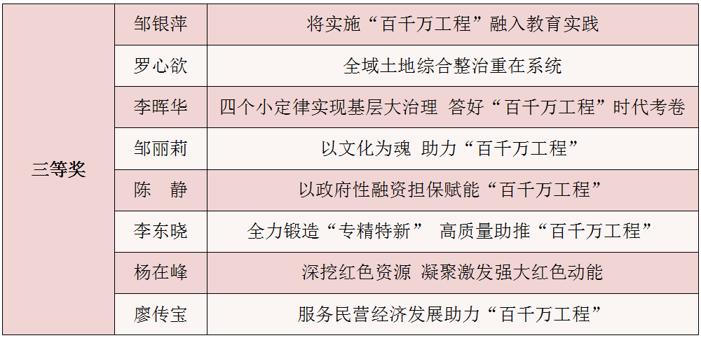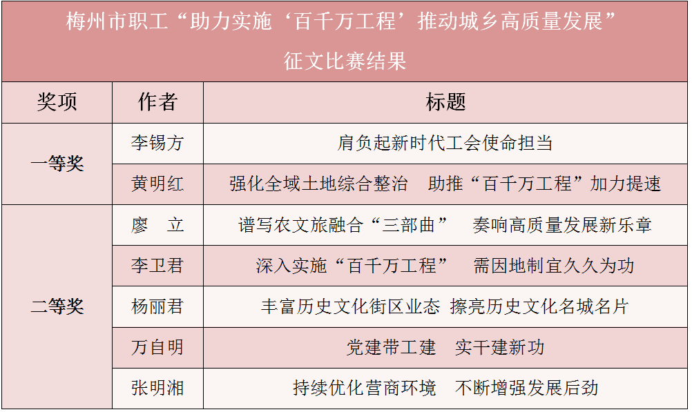 掌上梅州讯 近日,由梅州市总工会、梅州日报社联合举办的“中国梦·劳动美——凝心铸魂跟党走 团结奋斗新征程”梅州市职工“助力实施‘百千万工程’推动城乡高质量发展”主题征文比赛结果揭晓。经过线下评委和线上投票的综合评分,25件作品从全市各级各单位干部职工撰写的参赛作品中脱颖而出。其中,李锡方、黄明红分别获一等奖,廖立等5人获二等奖,邹银萍等8人获三等奖,另有10位作者获优秀奖。