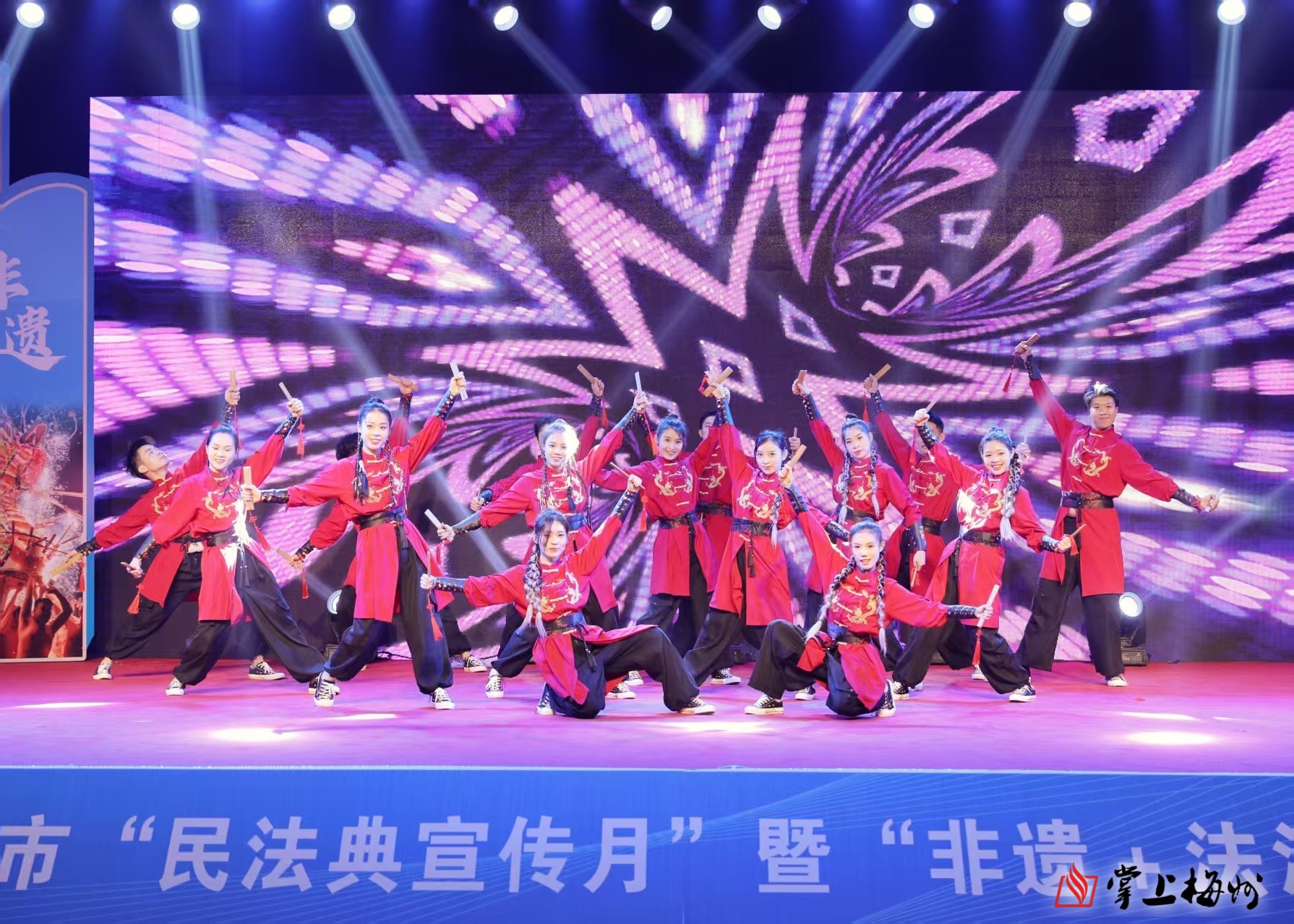 活动在由梅州市烟草专卖局和梅州市司法局联合制作的独具非遗特色的普法微电影《木偶人》中拉开序幕,非遗鼓舞《双龙腾飞》、非遗客家山歌对唱《打假打私志如钢》《喜事好运滚滚来》、非遗舞蹈《袅袅天籁声声脆》、非遗表演《卖仙人粄》《客家恋曲》、丰顺县司法局原创的非遗五句板表演唱《歌唱民法典》等节目接连上演,聚焦民法典、未成年人保护法、烟草专卖法及优化法治化营商环境等与群众生活密切相关的法律问题,以通俗易懂的剧情生动演绎和传递了法治观念。活动现场穿插的“法律知识有奖问答”环节,通过互动答题形式普及相关法律知识,群众参与热情高涨,学法氛围浓厚。最终,活动在歌舞《领航》中圆满落下帷幕。