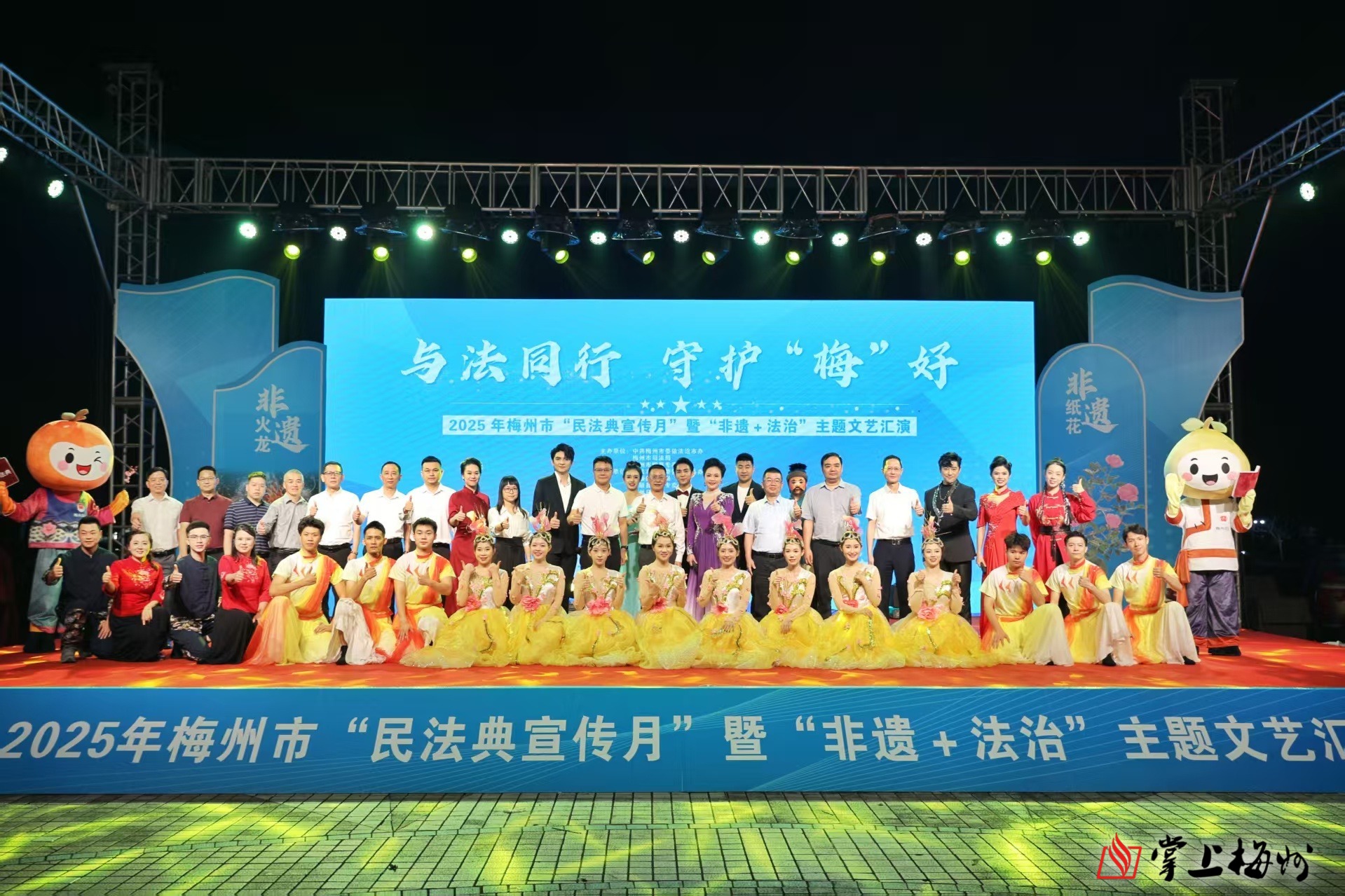 掌上梅州讯 2025年5月是全国第五个“民法典宣传月”。5月27日晚,“与法同行 守护‘梅’好”——2025年梅州市“民法典宣传月”暨“非遗+法治”主题文艺汇演在丰顺县新世纪文化广场举行。梅州市司法局、梅州市烟草专卖局、梅州日报社及丰顺县等相关领导出席活动。