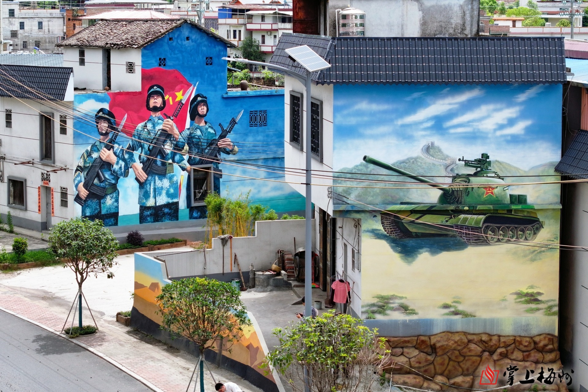 兴宁市黄槐镇沿线农房已完成外立面改造,各类军旅元素墙绘充满特色。(高讯 摄)