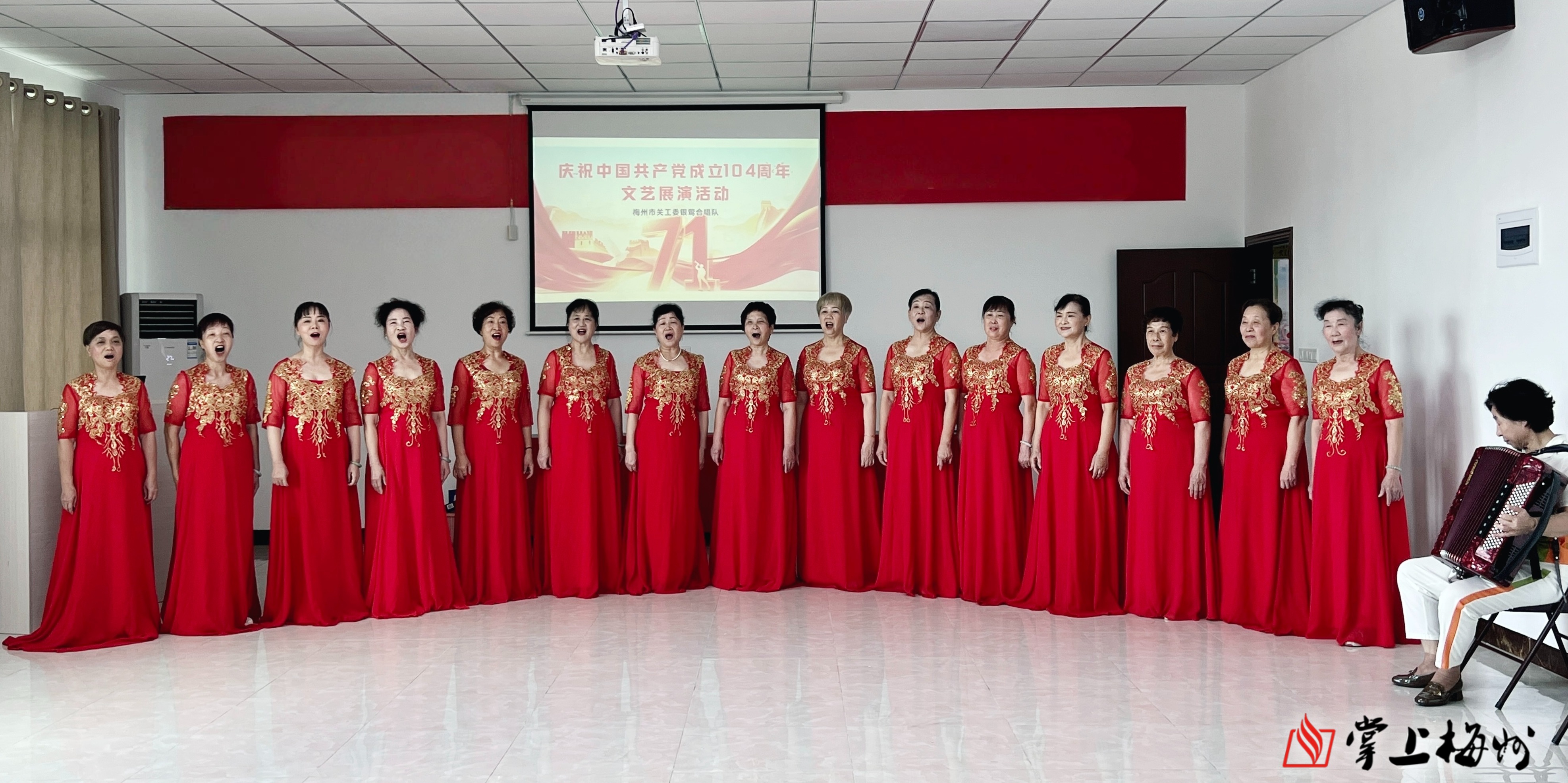掌上梅州讯 7月1日上午,梅州市关工委银莺合唱队举行庆祝中国共产党成立104周年歌唱活动。银莺合唱队成员们欢聚一堂,用歌声唱响对党和祖国的热爱。