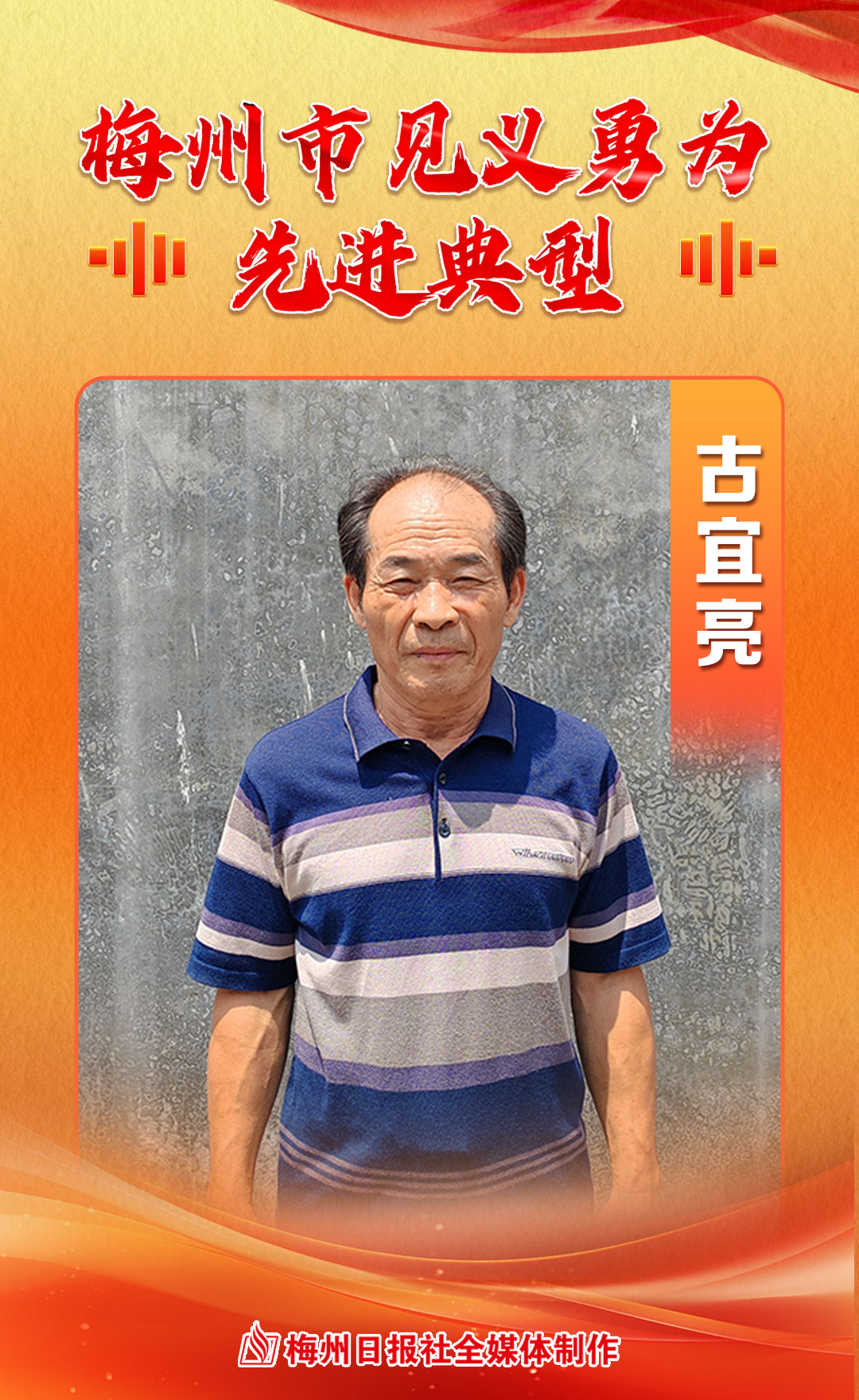 2024年12月24日7时30分左右,梅州市梅县区松口镇圳头村四上二村一间房屋因电线短路突发火灾,火势蔓延迅速。屋里有一人因行动不便且通道被火焰封堵,被困二楼。同村村民古宜亮发现后,从起火房屋一楼爬到二楼楼梯口,通过烧得火光四溅的房间门来到被困人员身边,直接背起被困人员再一次经过高温房间到达安全位置。后来在几名村干部的协作下,古宜亮将被困人员成功救出火场。