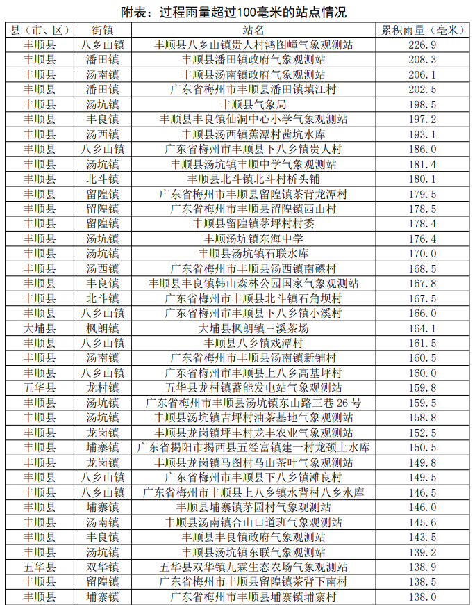 据气象水文监测,过程雨量(7月19日08时至22日08时),全市平均雨量65.1毫米,各县(市、区)平均雨量(单位:毫米):丰顺150.5、五华74.6、大埔72.6、梅江63.8、梅县44.6、兴宁35.7、平远23.8、蕉岭23.3;各县(市、区)最大雨量(单位:毫米):丰顺八乡山254.8、大埔枫朗211.3、五华龙村193.7、梅县梅南144.5、兴宁水口130.0、梅江长沙99.2、平远长田58.5、蕉岭三圳37.3。