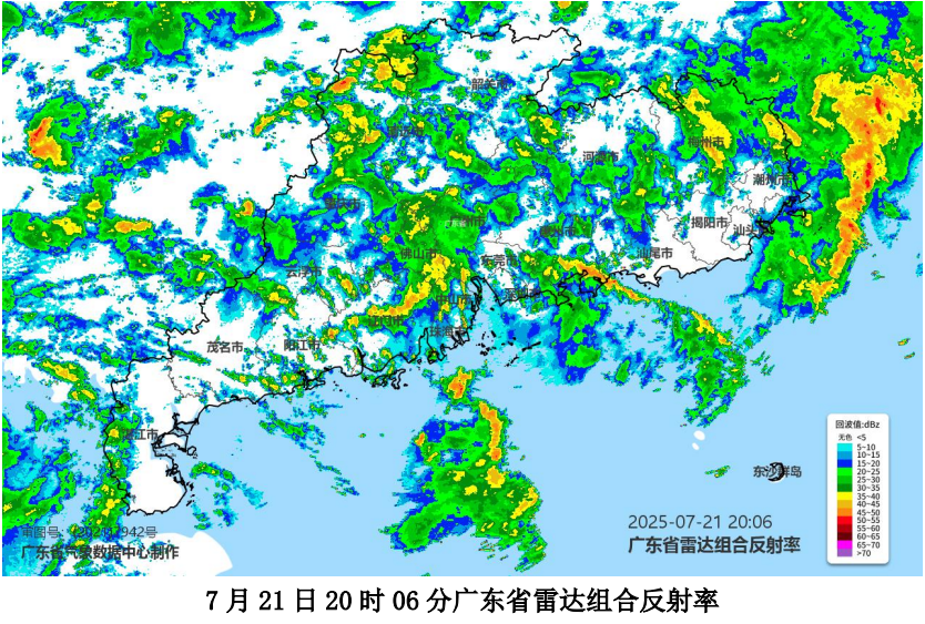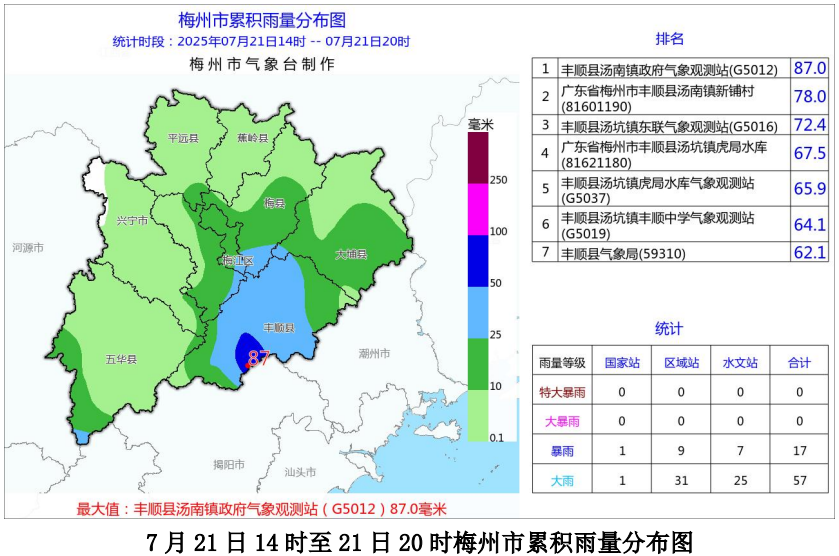 7月21日08时至22日08时,全市平均雨量32.0毫米,各县(市、区)平均雨量(单位:毫米):丰顺69.0、大埔40.5、梅江38.7、五华32.7、梅县23.6、蕉岭14.7、兴宁13.3、平远12.3;各县(市、区)雨量最大的镇街(单位:毫米):丰顺汤西120.1、大埔枫朗109.2、五华龙村96.2、梅县梅南60.0、梅江长沙58.6、兴宁水口53.0、平远长田35.5、蕉岭南磜28.0。