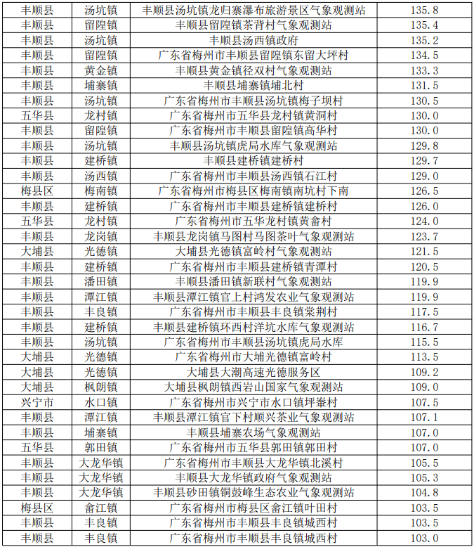 据统计,20日00时至18时50分丰顺录得雨量较大的乡镇(单位:毫米):八乡山110.2、留隍95.5、丰良56.6、潭江51.5、汤坑46.4、潘田45.4、汤南39.9。