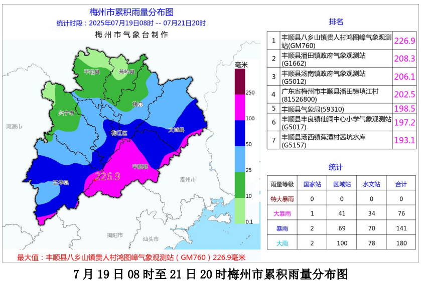 据气象水文监测,过程雨量(7 月19 日08 时至21日20 时),全市平均雨量 52.1 毫米,各县(市、区)平均雨量(单位:毫米):丰顺 129.8、五华58.5、大埔54.9、梅江 51.9、梅县 36.7、兴宁 28.8、平远15.3、蕉岭13.1;各县(市、区)最大雨量(单位:毫米):丰顺八乡山226.9、大埔枫朗 164.1、五华龙村 159.8、梅县梅南126.5、兴宁水口 107.5、梅江长沙 83.8、平远长田46.6、蕉岭蓝坊24.3。