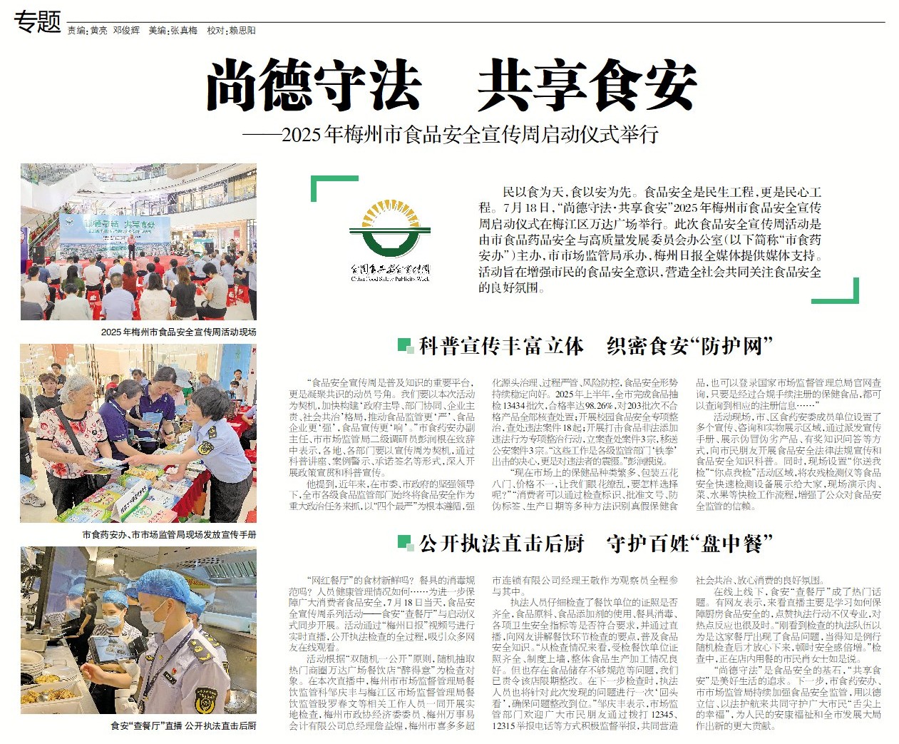 民以食为天,食以安为先。食品安全是民生工程,更是民心工程。7月18日,“尚德守法·共享食安”2025年梅州市食品安全宣传周启动仪式在梅江区万达广场举行。此次食品安全宣传周活动是由市食品药品安全与高质量发展委员会办公室(以下简称“市食药安办”)主办,市市场监管局承办,梅州日报全媒体提供媒体支持。活动旨在增强市民的食品安全意识,营造全社会共同关注食品安全的良好氛围。