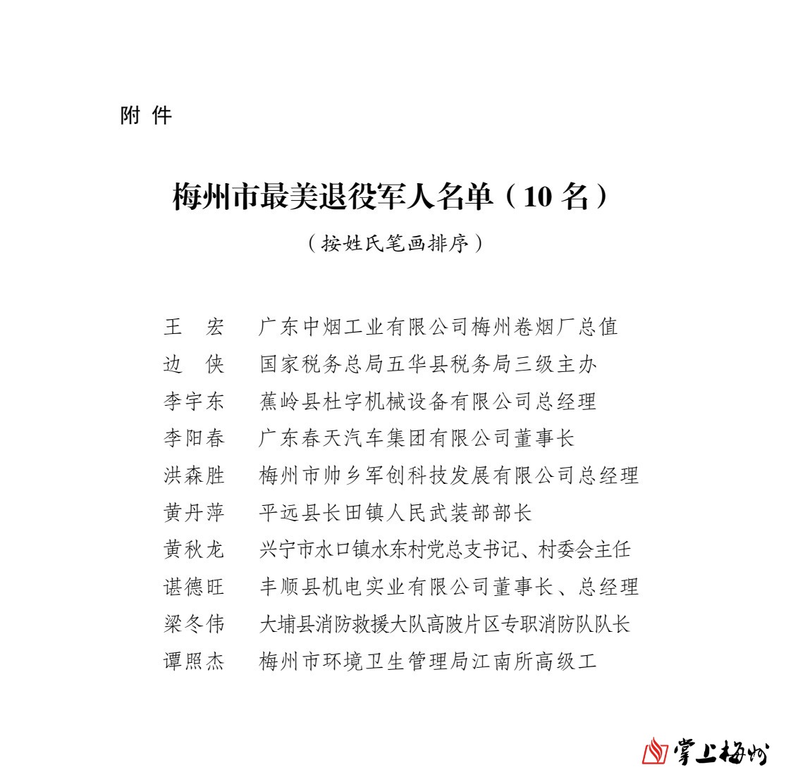 掌上梅州讯 近日,《中共梅州市委 梅州市人民政府关于表彰梅州市最美退役军人的决定》印发,授予10名同志“梅州市最美退役军人”称号。