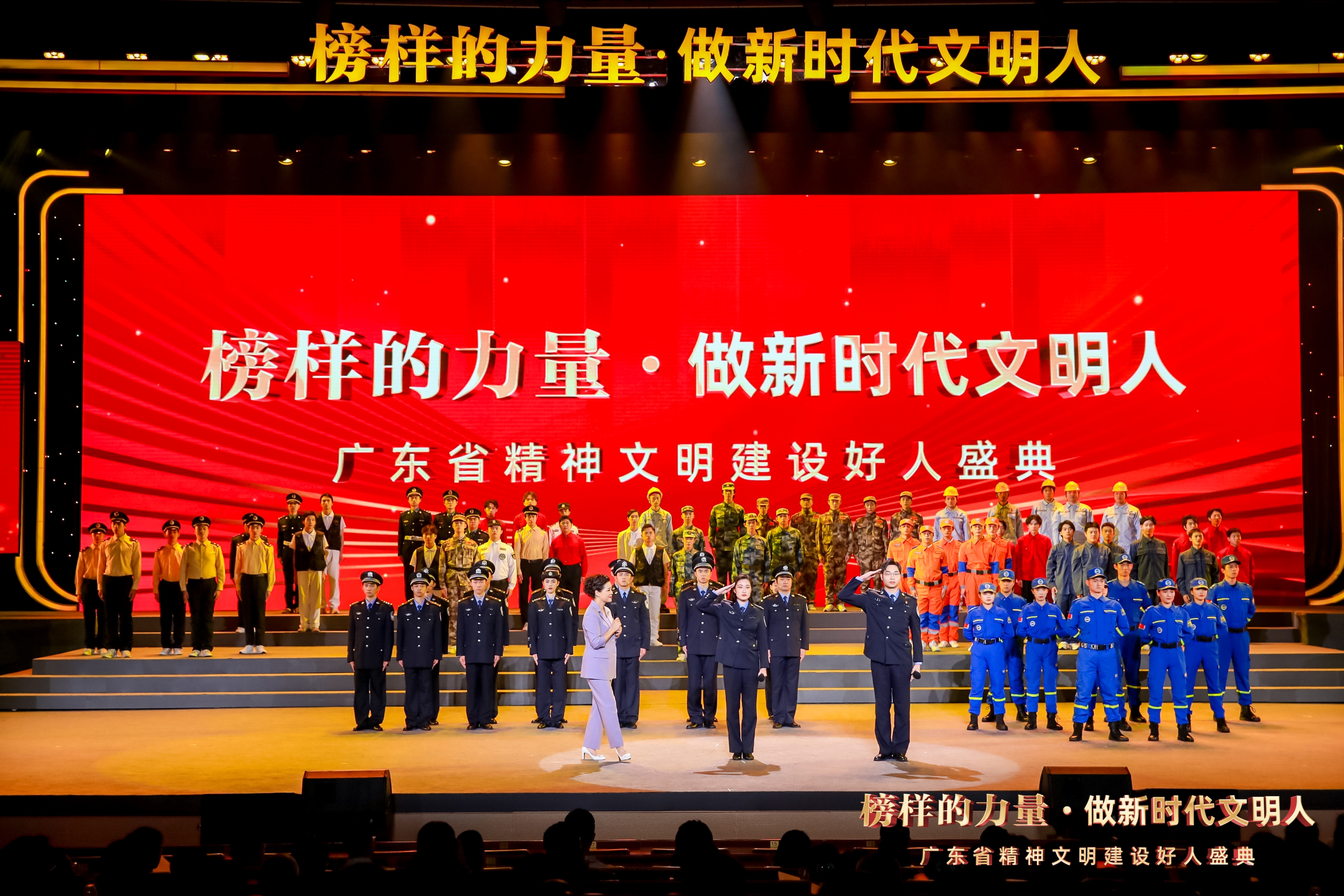 2024年1月20日,“榜样的力量·做新时代文明人”广东省精神文明建设好人盛典在广州举办。图为梅州市因公牺牲民警、全国公安系统二级英雄模范李小平的故事及警号重启仪式舞台再现,李小平之女李紫茹与父亲进行时空对话。