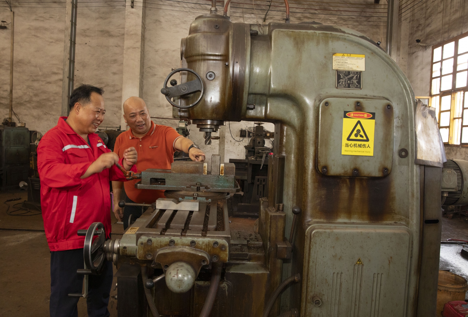 李宇东(右)与厂长探讨交流技术问题。