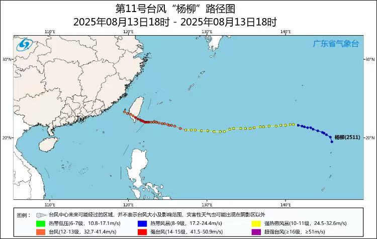 今年第11号台风“杨柳”(强台风级)的中心已于今天(8月13日)13时前后在台湾省台东县太麻里乡沿海登陆,登陆时中心附近最大风力14级(42米/秒),中心最低气压955百帕。