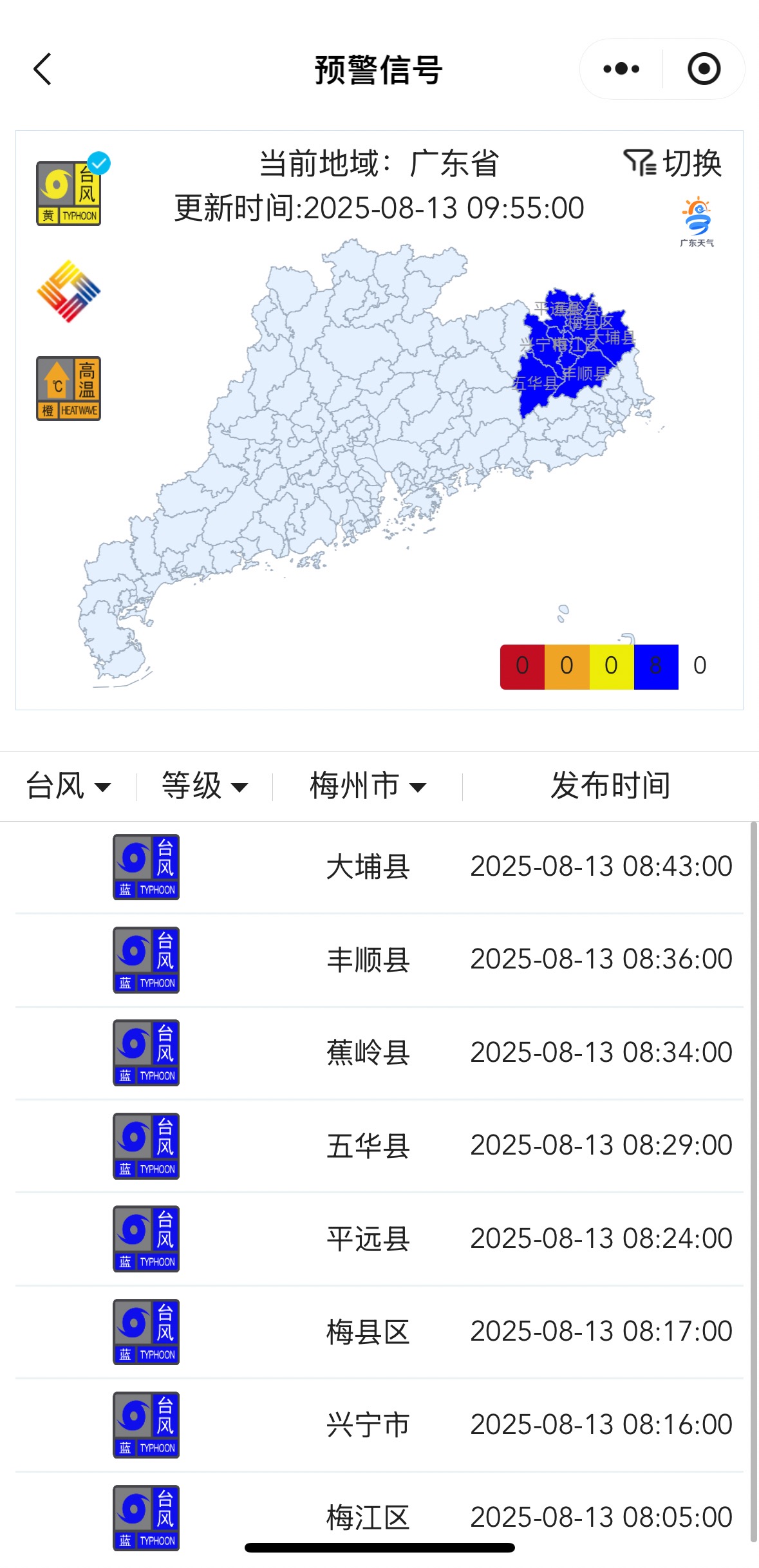 记者从气象部门获悉,受台风“杨柳”影响,预计13到14日梅州将有一次明显风雨过程,今日上午,全市台风白色预警信号升级为蓝色预警信号,注意防御!